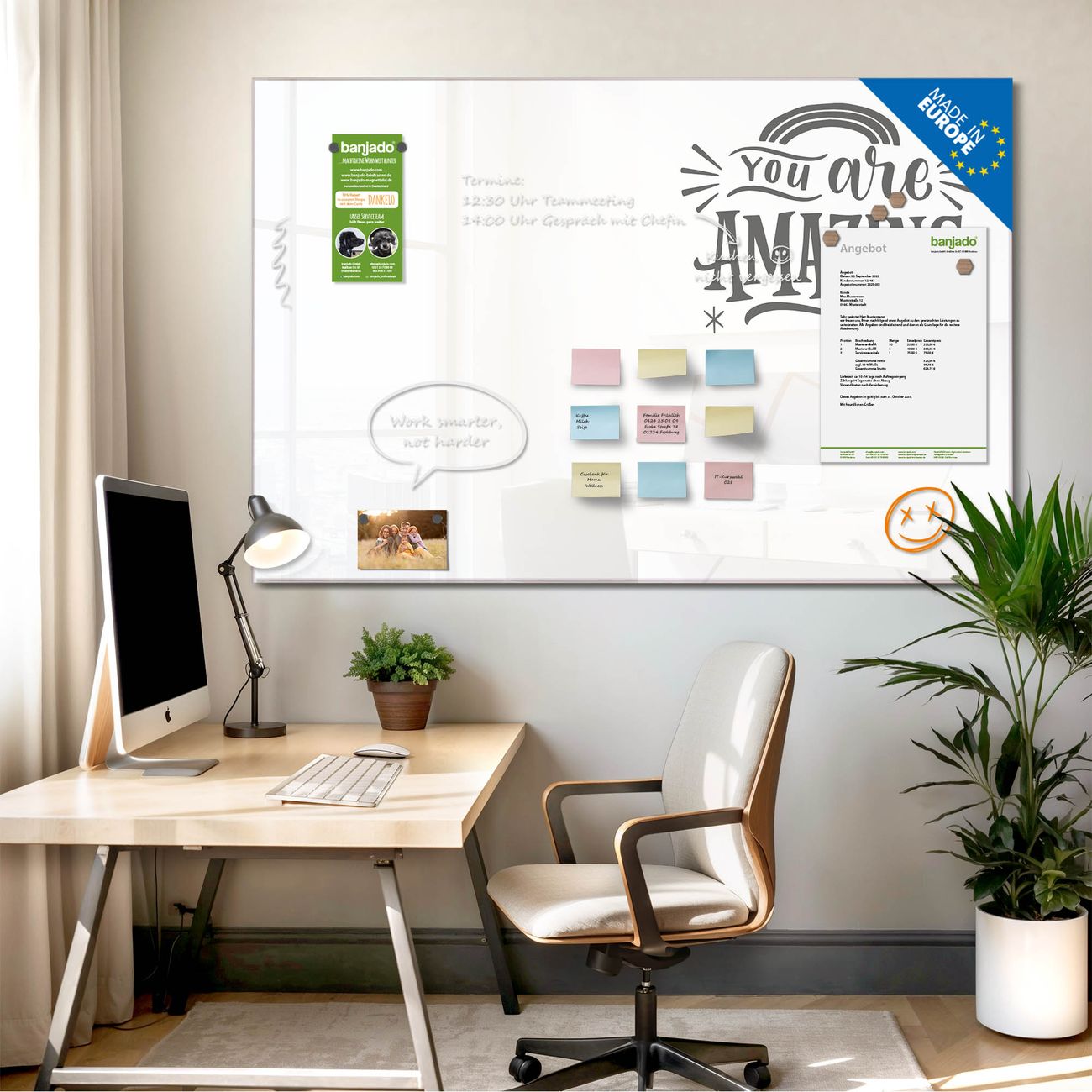 Jede Glas Magnettafel wird in unserer Werkstatt von Hand gefertigt und sorgfältig geprüft. So erhalten Sie ein echtes Qualitätsprodukt, das Funktion und Ästhetik perfekt vereint.?? Warum banjado?