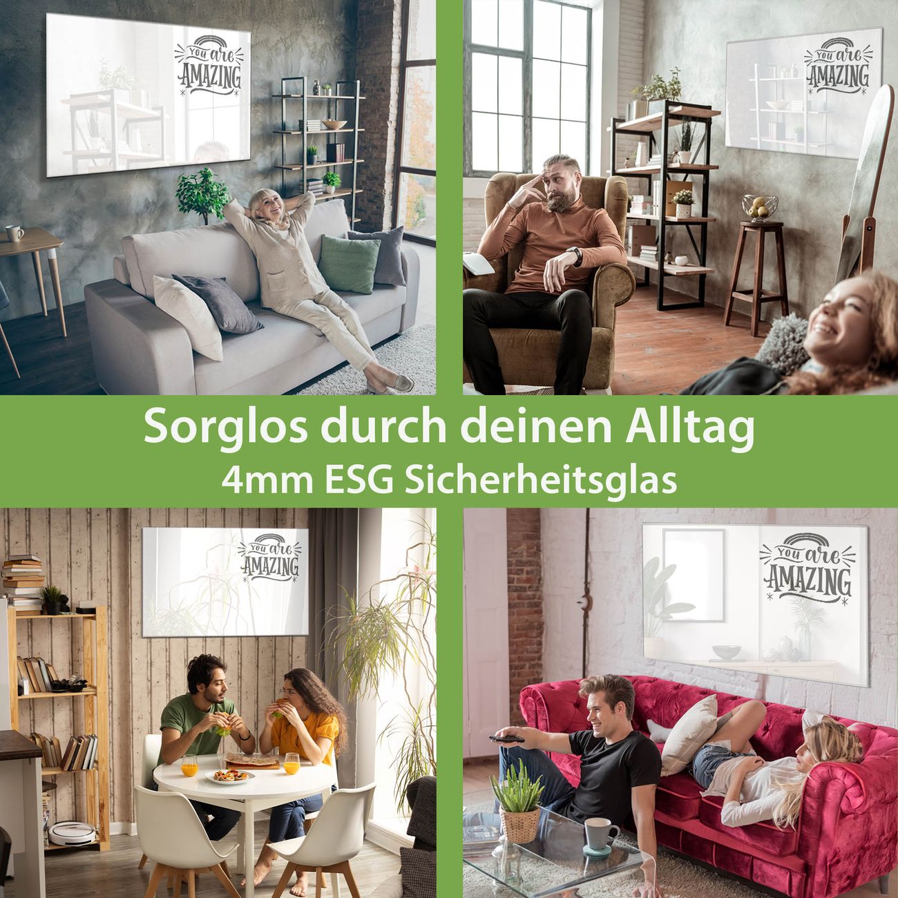 - Material: 4mm Sicherheitsglas mit Metallrückwand