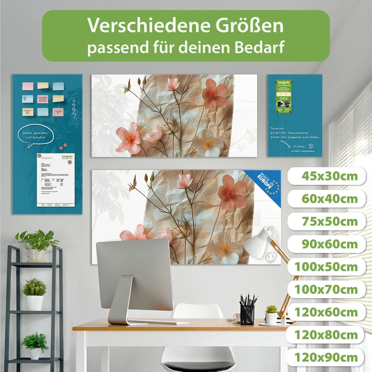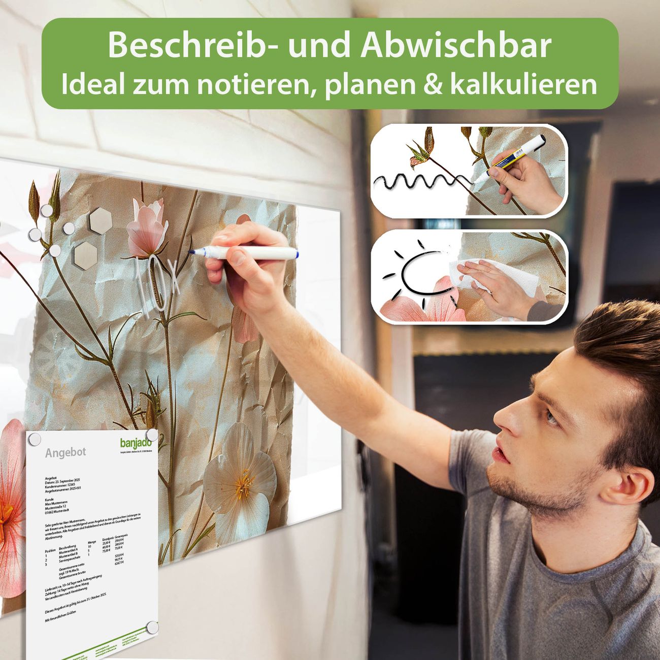 Jede Glas Magnettafel wird in unserer Werkstatt von Hand gefertigt und sorgfältig geprüft. So erhalten Sie ein echtes Qualitätsprodukt, das Funktion und Ästhetik perfekt vereint.?? Warum banjado?