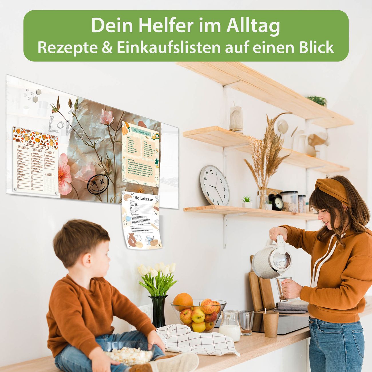Auf der glatten Glasoberfläche lassen sich Termine, Rezepte oder Notizen ganz einfach mit Kreidestiften festhalten und rückstandslos entfernen. Starke Neodym-Magnete halten Ihre wichtigsten Erinnerungen sicher an Ort und Stelle. So entsteht Ihre ganz persönliche Ideenwand - jeden Tag neu.
