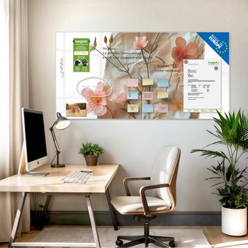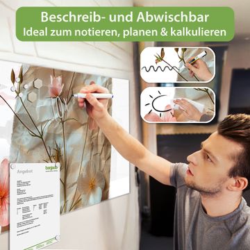 Die banjado Glas Magnettafel mit dem Motiv Motiv Zarte Blütenkomposition verbindet Funktionalität mit Stil. Sie ersetzt das Zettelchaos durch klare Strukturen und bringt dabei eine warme, natürliche Atmosphäre in Ihr Zuhause. Ob im Büro, in der Küche oder im Eingangsbereich - dieses Design-Board zieht Blicke an und sorgt für Ordnung mit Charakter.