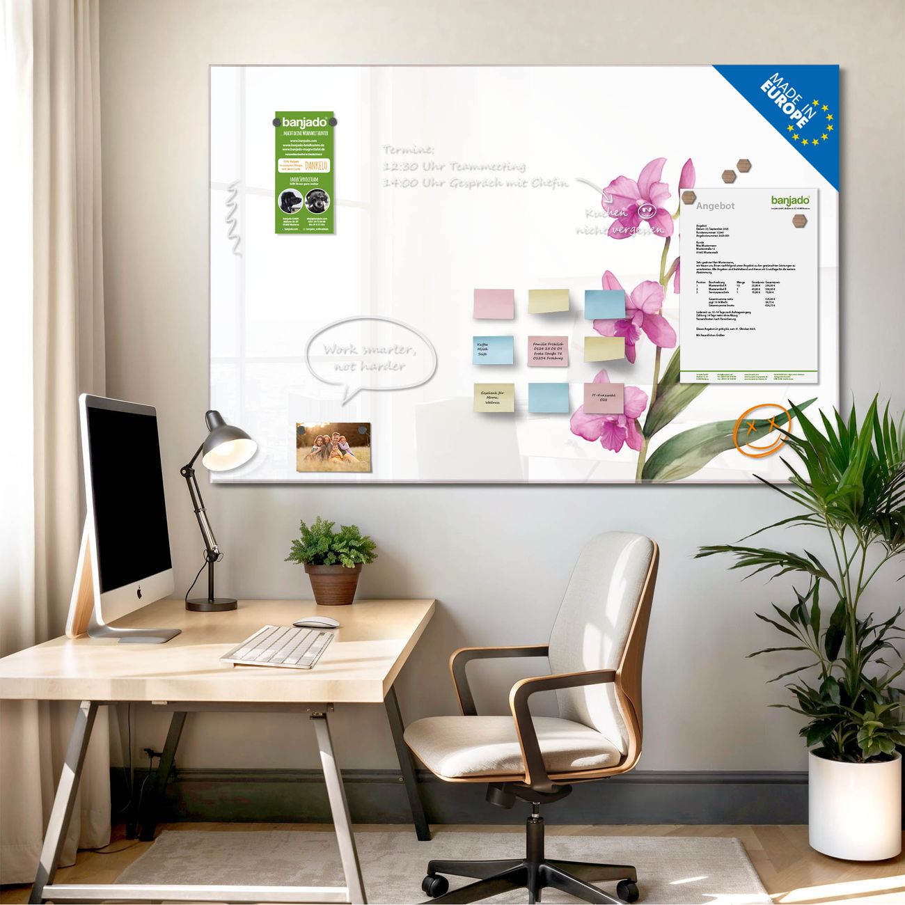 Die banjado Glas Magnettafel mit dem Motiv Motiv Zarte Orchidee verbindet Funktionalität mit Stil. Sie ersetzt das Zettelchaos durch klare Strukturen und bringt dabei eine warme, natürliche Atmosphäre in Ihr Zuhause. Ob im Büro, in der Küche oder im Eingangsbereich - dieses Design-Board zieht Blicke an und sorgt für Ordnung mit Charakter.