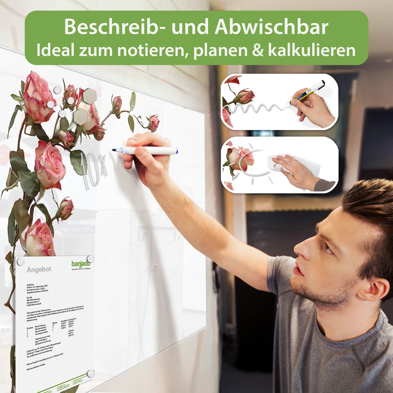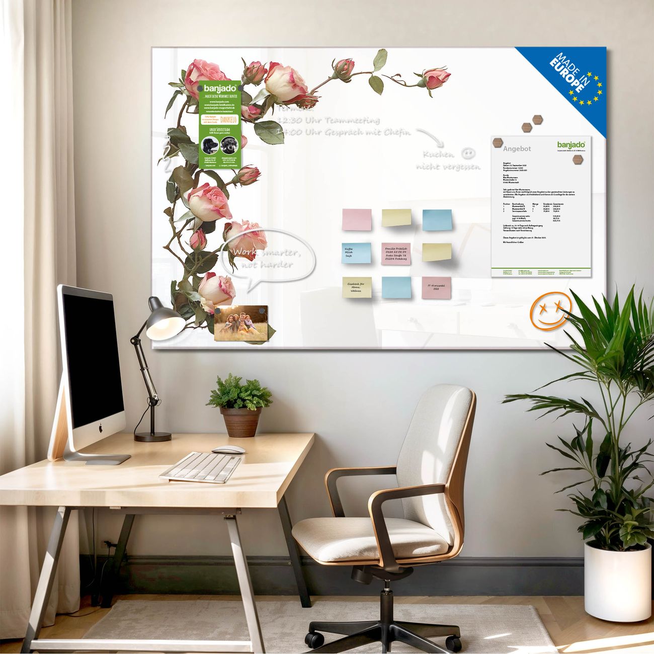 Die banjado Glas Magnettafel mit dem Motiv Motiv Zarte Rosenpracht verbindet Funktionalität mit Stil. Sie ersetzt das Zettelchaos durch klare Strukturen und bringt dabei eine warme, natürliche Atmosphäre in Ihr Zuhause. Ob im Büro, in der Küche oder im Eingangsbereich - dieses Design-Board zieht Blicke an und sorgt für Ordnung mit Charakter.