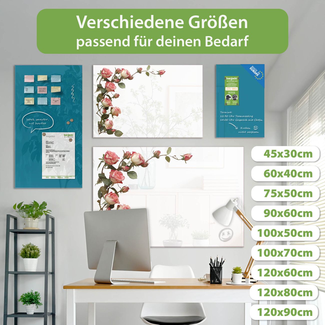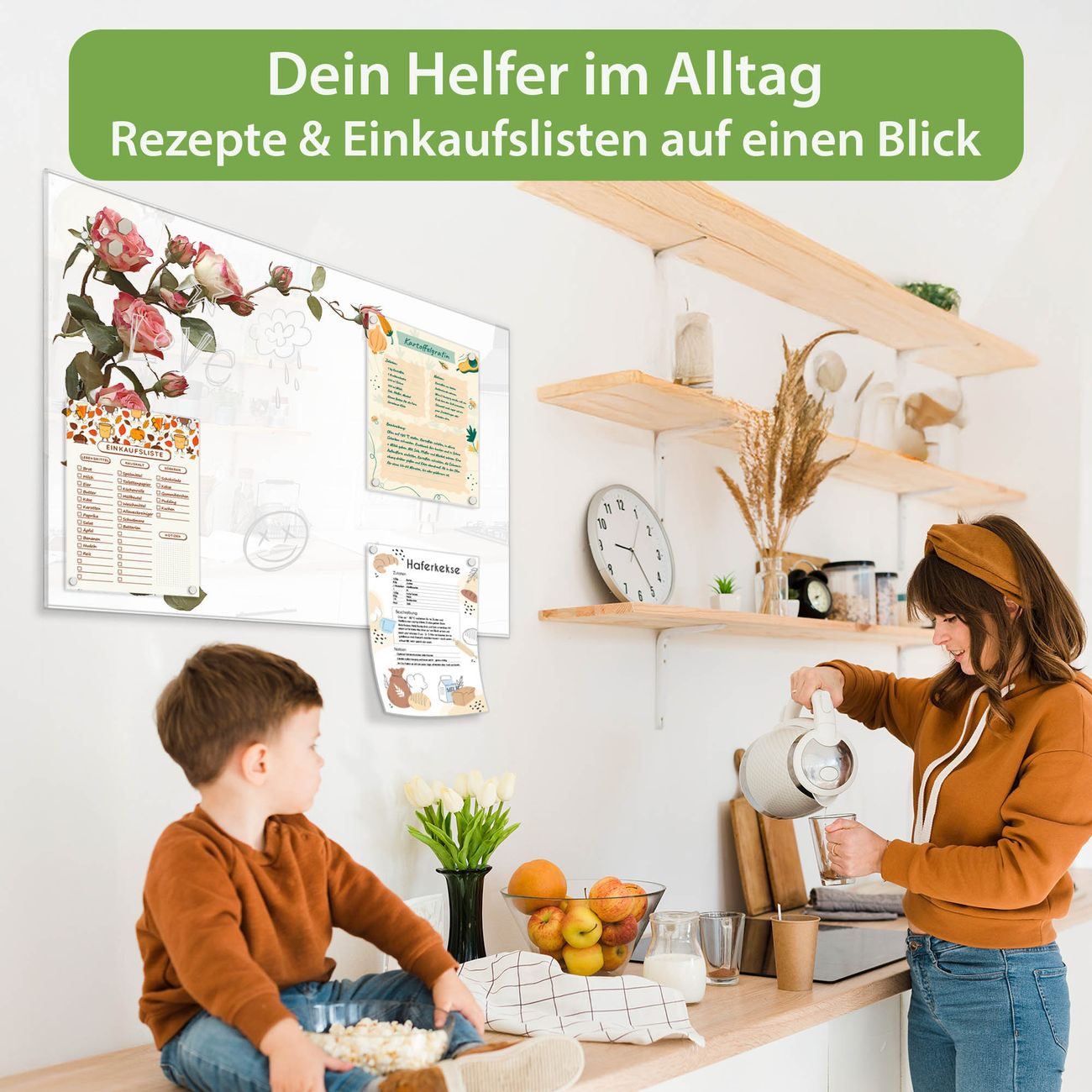 Ein Stück Design, das Ihren Alltag organisiert. Schreiben, heften, inspirieren - alles an einem Ort. Qualität, die man spürt. Montage leicht gemacht. Handwerk mit Herz - veredelt in Sachsen. Einzigartiges Design mit Motiv Motiv Zarte Rosenpracht Beschreibbare Glasoberfläche, leicht zu reinigen Starke Magnetkraft durch Stahlrückwand Inklusive 4 Neodym-Magneten Flexible Montageoptionen Handveredelt in Sachsen - Qualität, die bleibt