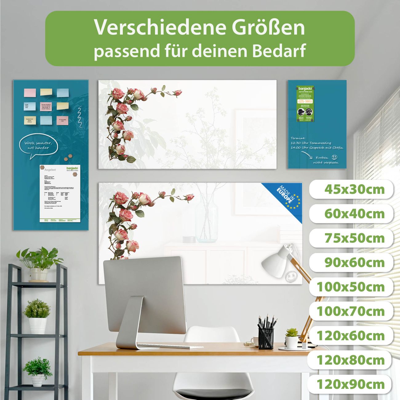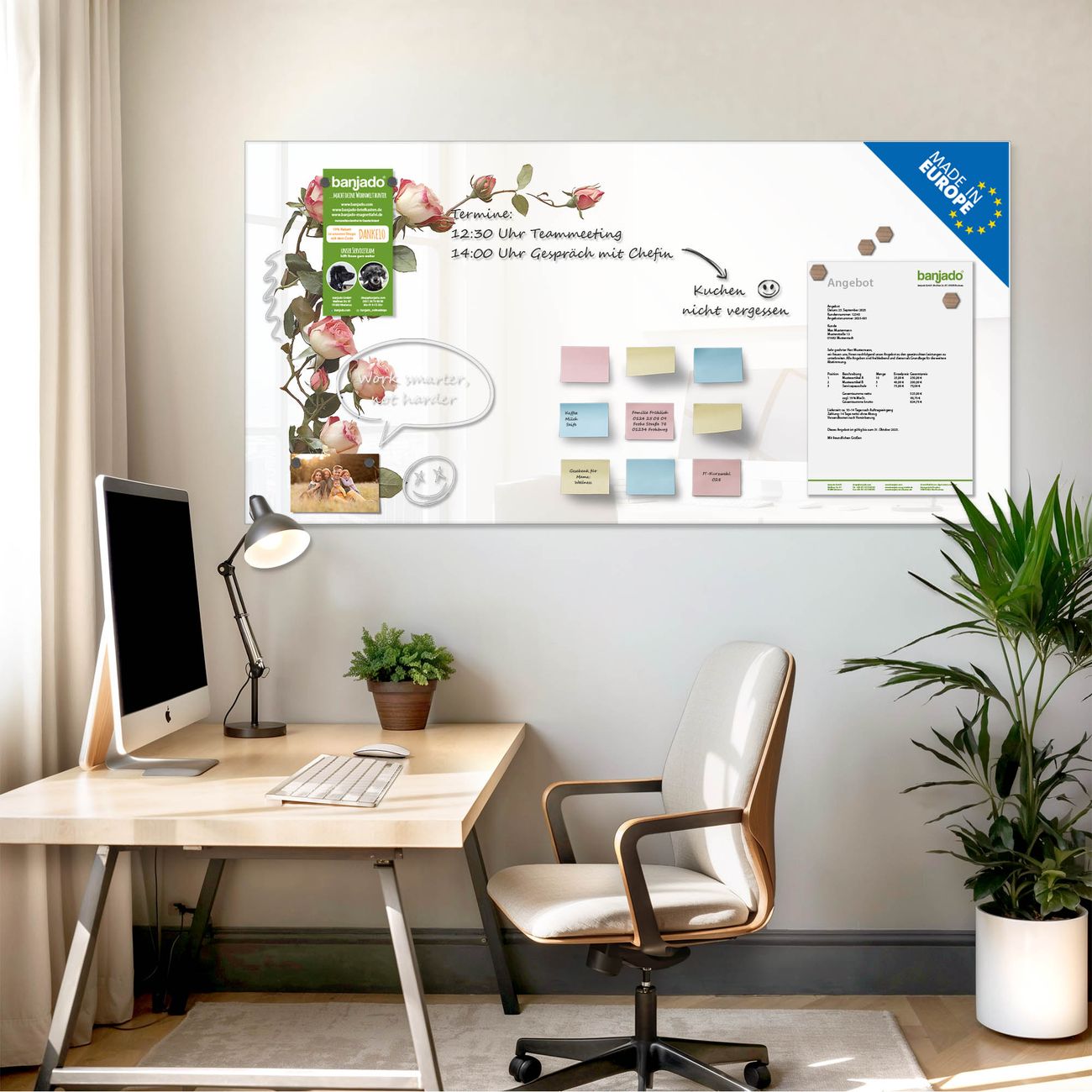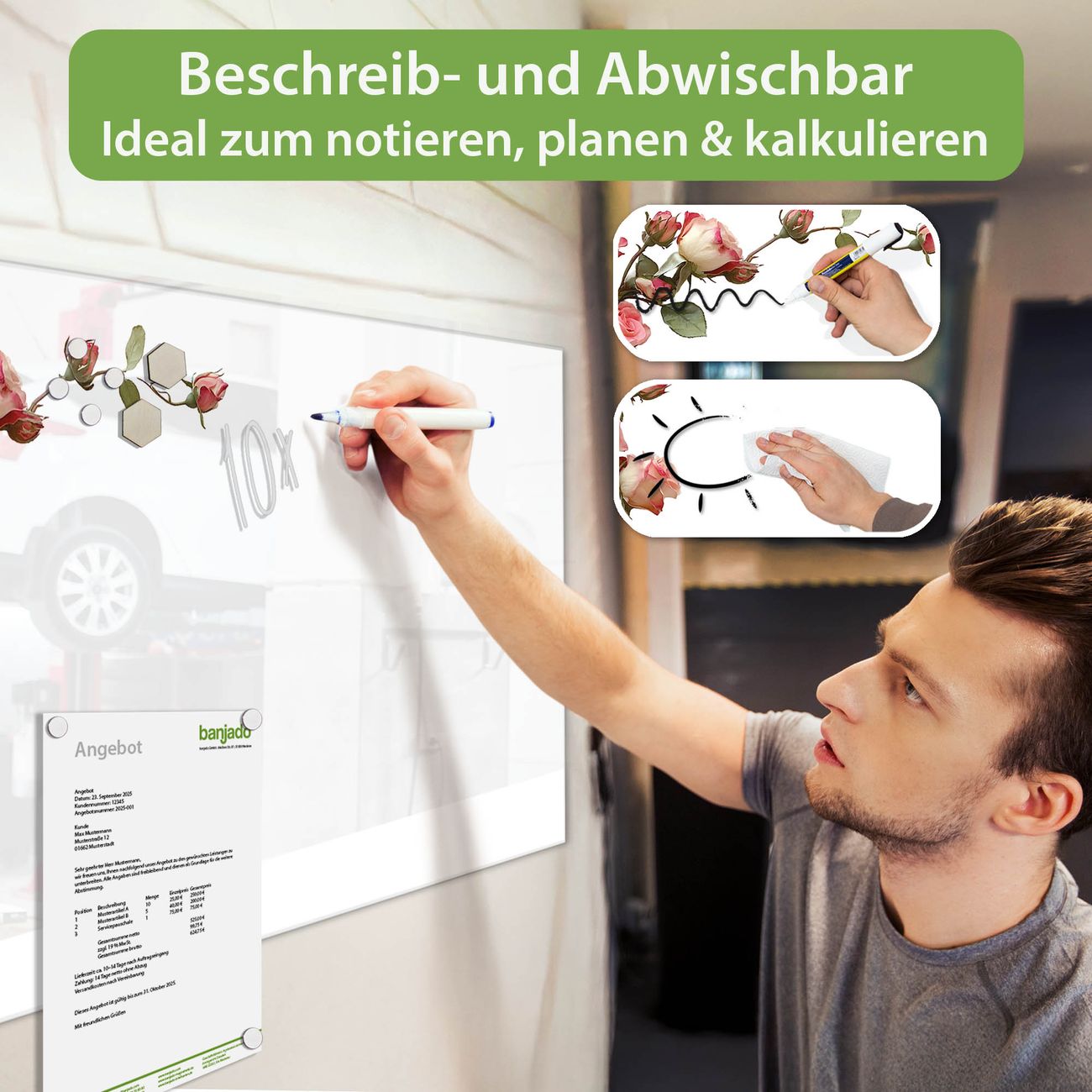 Jede Glas Magnettafel wird in unserer Werkstatt von Hand gefertigt und sorgfältig geprüft. So erhalten Sie ein echtes Qualitätsprodukt, das Funktion und Ästhetik perfekt vereint.?? Warum banjado?