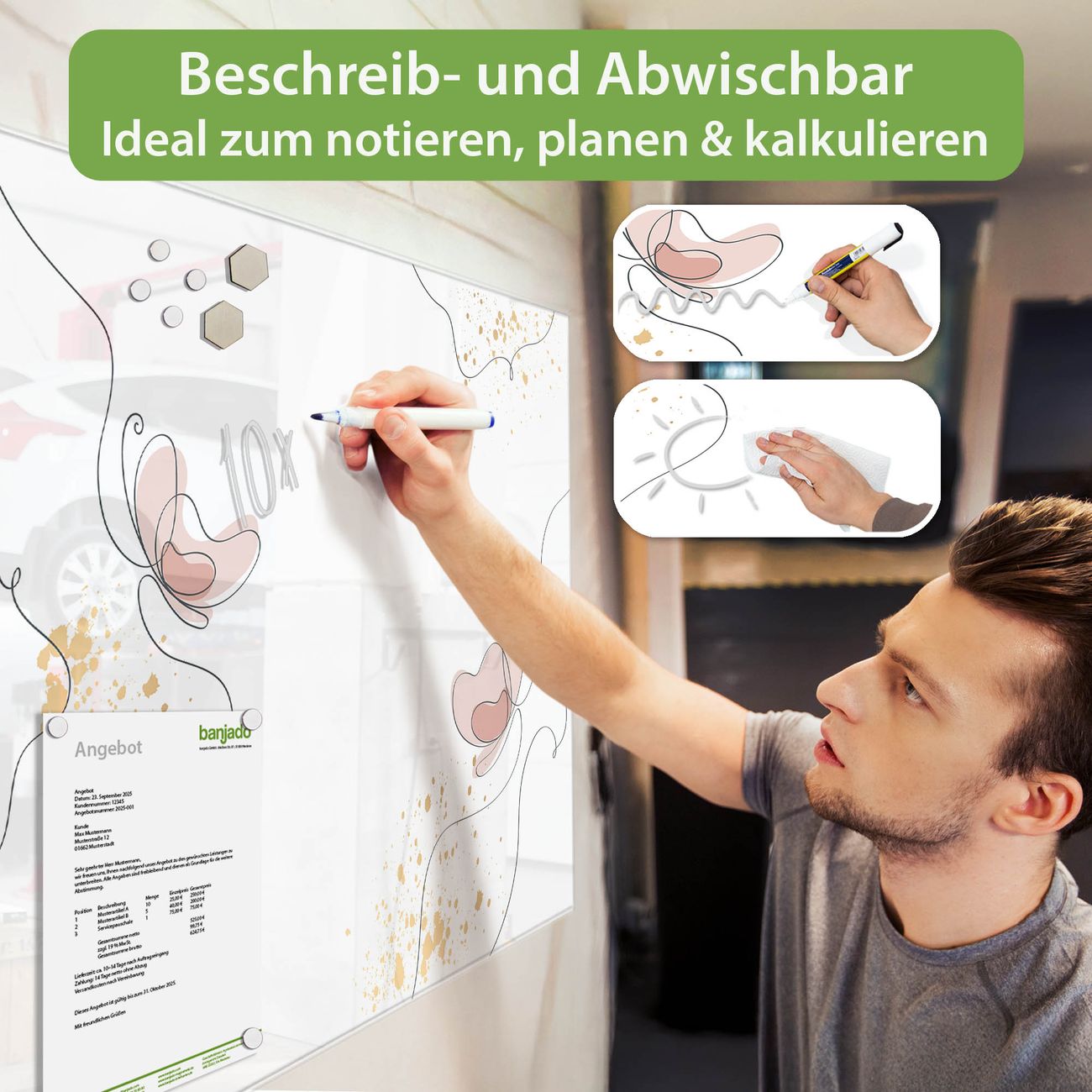 Die banjado Glas Magnettafel mit dem Motiv Motiv Zarte Schmetterlingslinie verbindet Funktionalität mit Stil. Sie ersetzt das Zettelchaos durch klare Strukturen und bringt dabei eine warme, natürliche Atmosphäre in Ihr Zuhause. Ob im Büro, in der Küche oder im Eingangsbereich - dieses Design-Board zieht Blicke an und sorgt für Ordnung mit Charakter.
