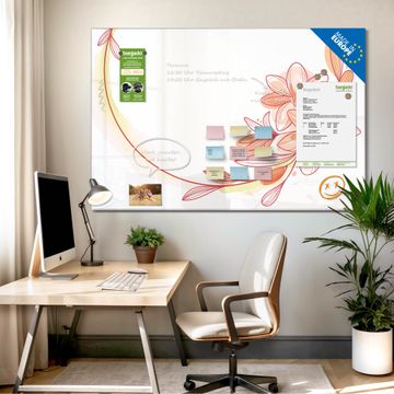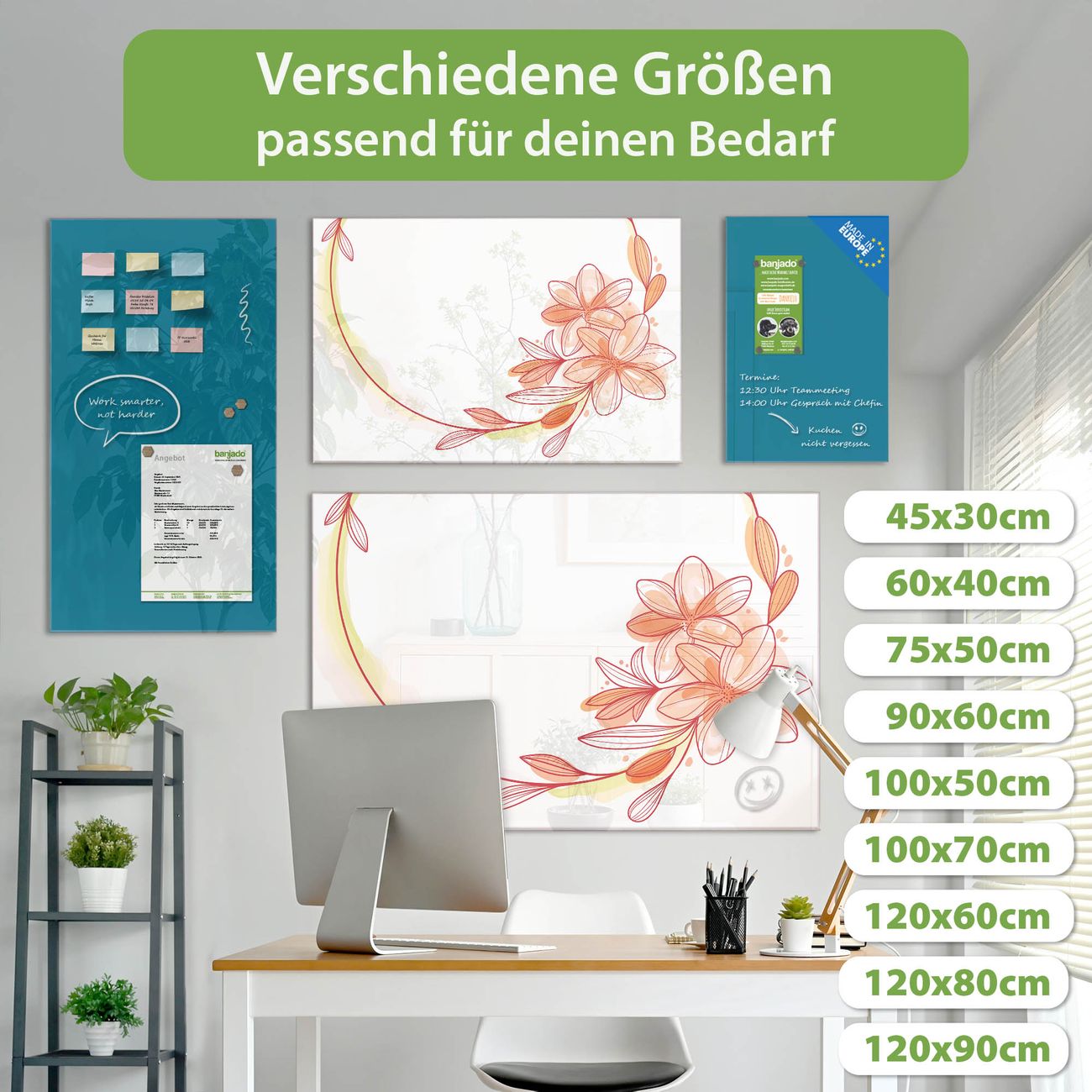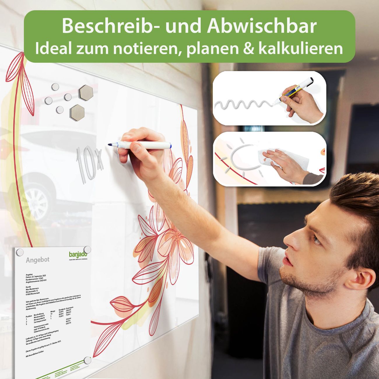 Die banjado Glas Magnettafel mit dem Motiv Motiv Zarter Blütenkranz verbindet Funktionalität mit Stil. Sie ersetzt das Zettelchaos durch klare Strukturen und bringt dabei eine warme, natürliche Atmosphäre in Ihr Zuhause. Ob im Büro, in der Küche oder im Eingangsbereich - dieses Design-Board zieht Blicke an und sorgt für Ordnung mit Charakter.