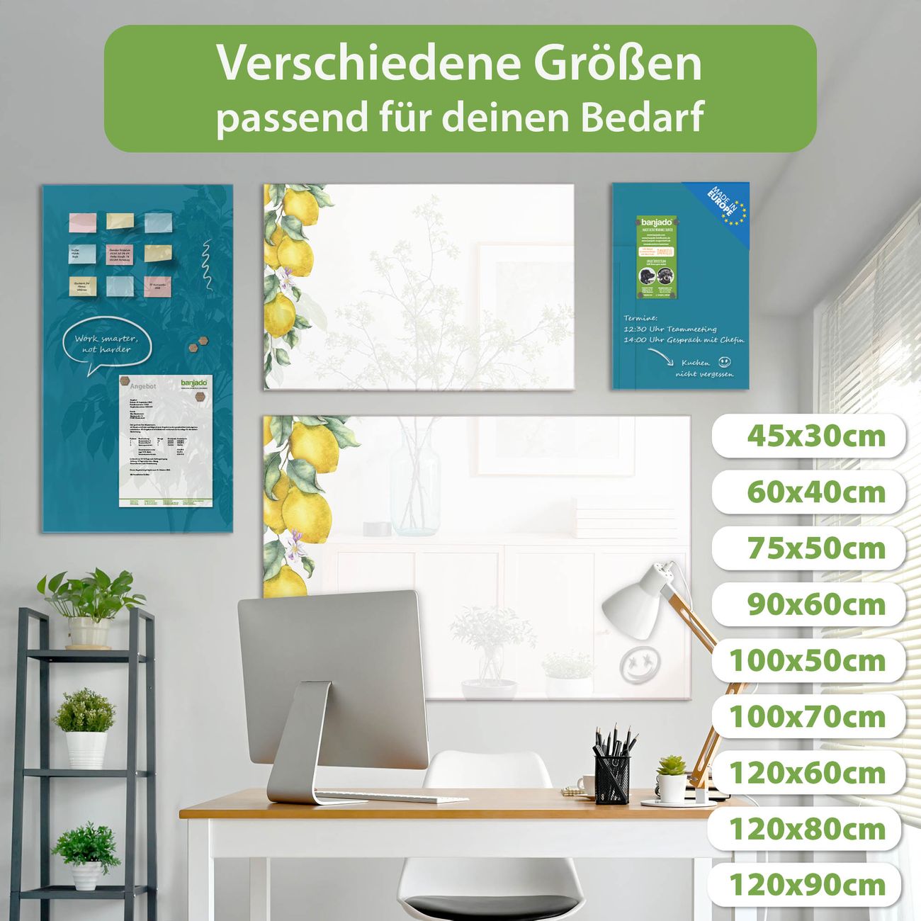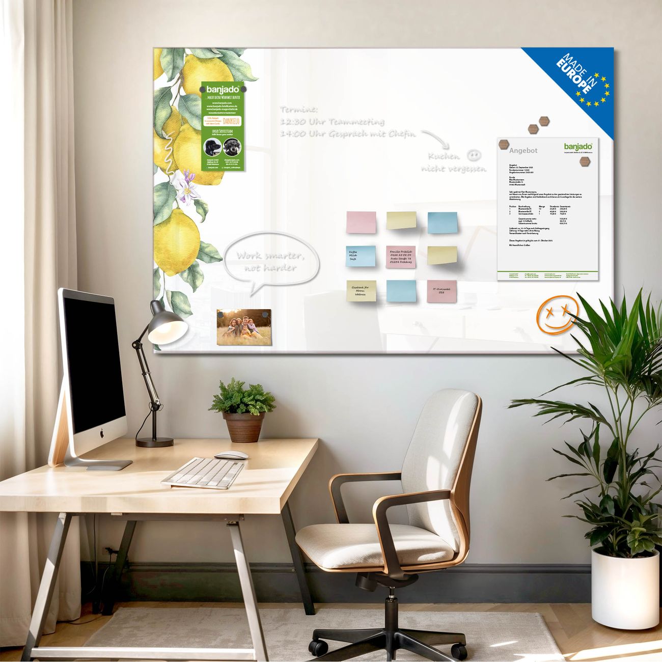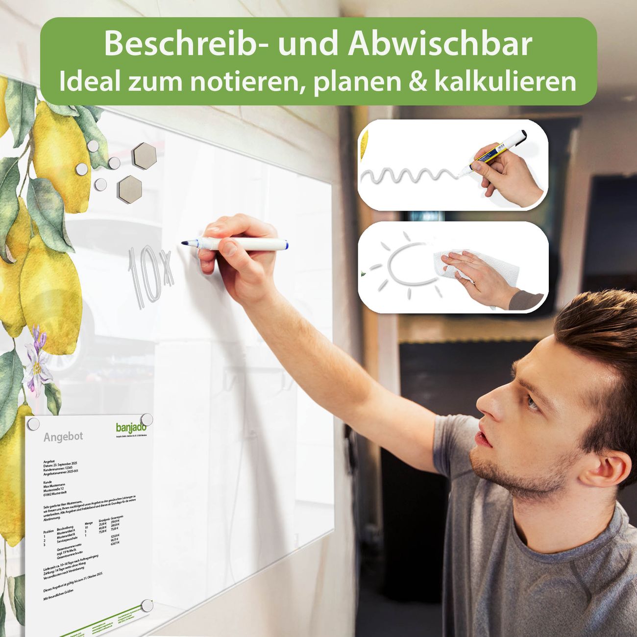 Die banjado Glas Magnettafel mit dem Motiv Motiv Zitronenzweig Aquarell verbindet Funktionalität mit Stil. Sie ersetzt das Zettelchaos durch klare Strukturen und bringt dabei eine warme, natürliche Atmosphäre in Ihr Zuhause. Ob im Büro, in der Küche oder im Eingangsbereich - dieses Design-Board zieht Blicke an und sorgt für Ordnung mit Charakter.