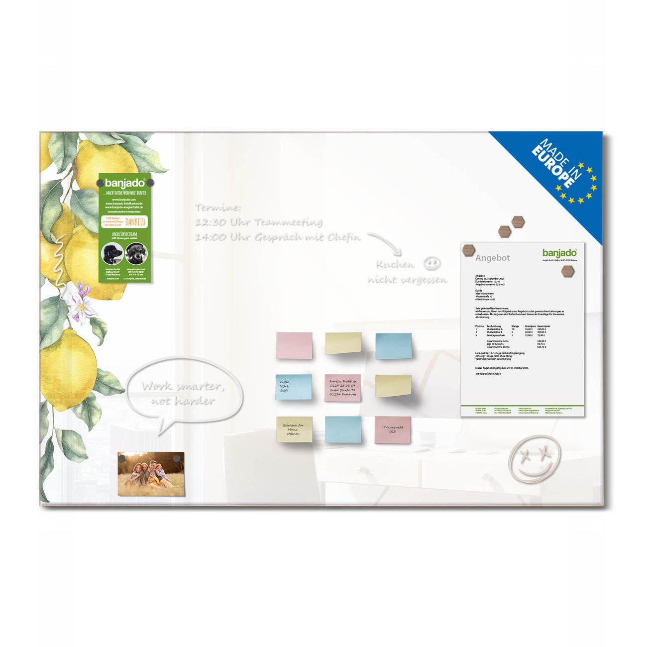 Die banjado Glas Magnettafel mit dem Motiv Motiv Zitronenzweig Aquarell verbindet Funktionalität mit Stil. Sie ersetzt das Zettelchaos durch klare Strukturen und bringt dabei eine warme, natürliche Atmosphäre in Ihr Zuhause. Ob im Büro, in der Küche oder im Eingangsbereich - dieses Design-Board zieht Blicke an und sorgt für Ordnung mit Charakter.