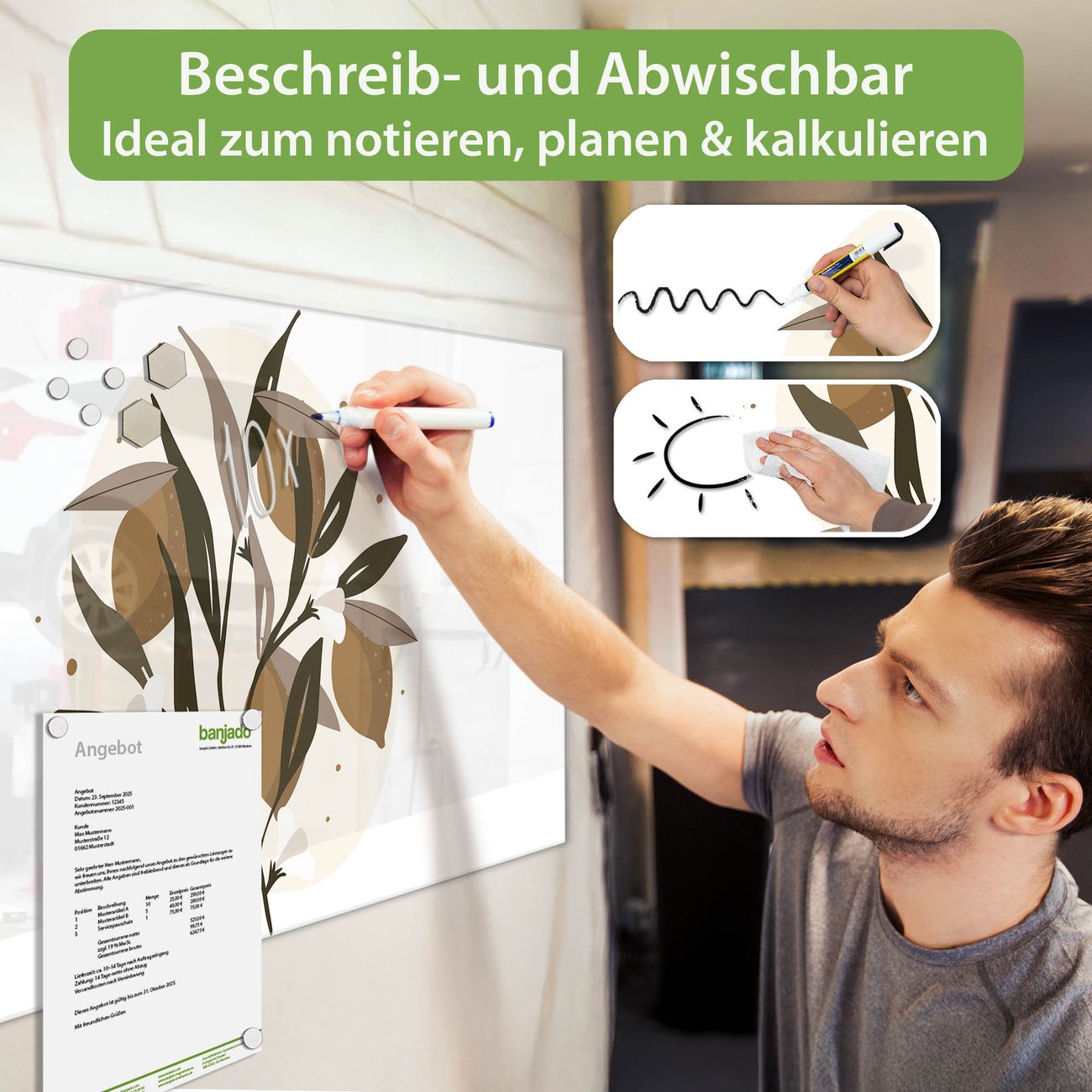 Jede Glas Magnettafel wird in unserer Werkstatt von Hand gefertigt und sorgfältig geprüft. So erhalten Sie ein echtes Qualitätsprodukt, das Funktion und Ästhetik perfekt vereint.?? Warum banjado?