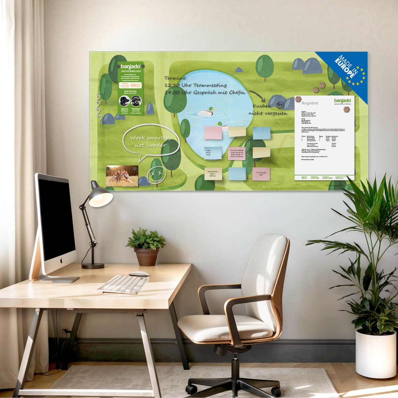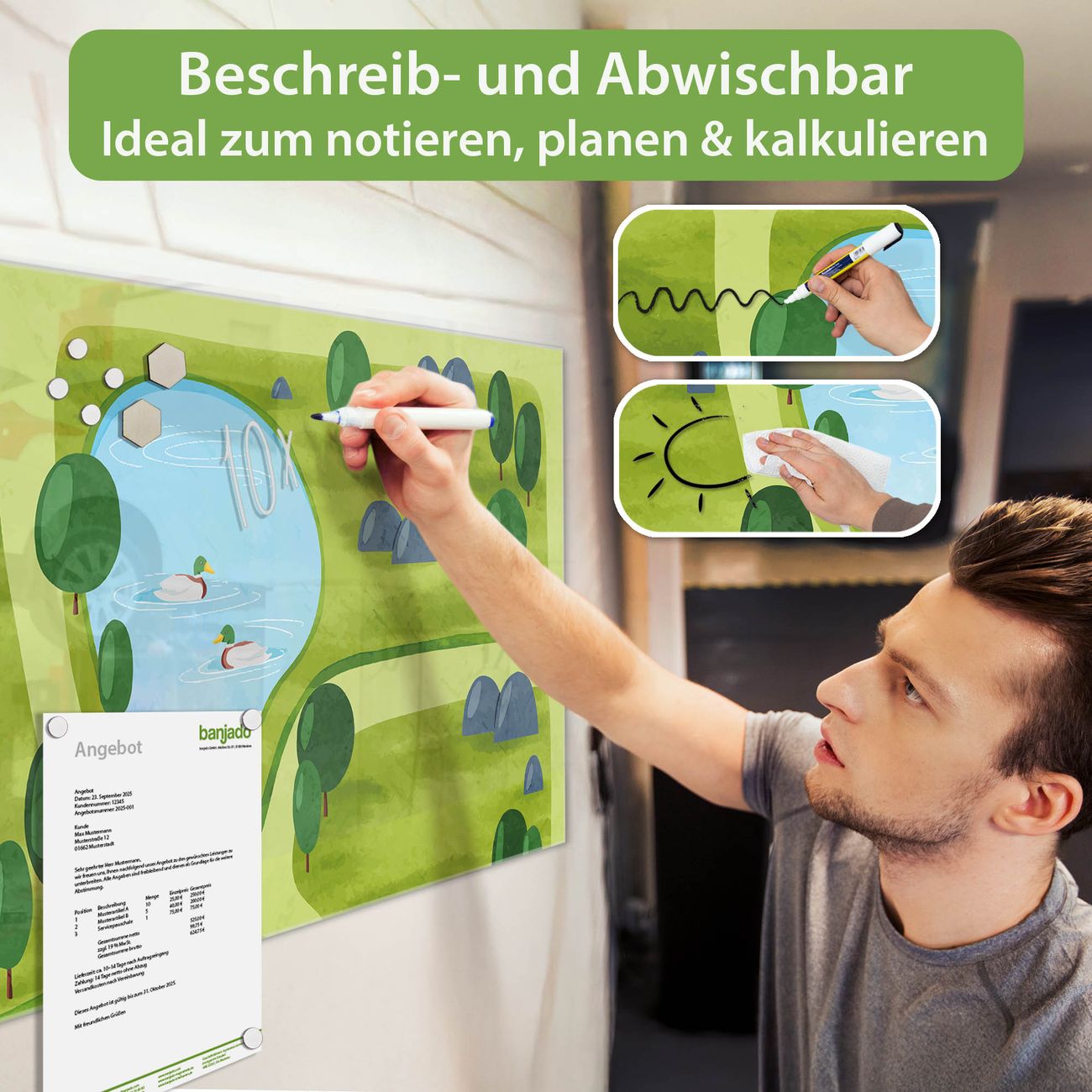 Jede Glas Magnettafel wird in unserer Werkstatt von Hand gefertigt und sorgfältig geprüft. So erhalten Sie ein echtes Qualitätsprodukt, das Funktion und Ästhetik perfekt vereint.?? Warum banjado?