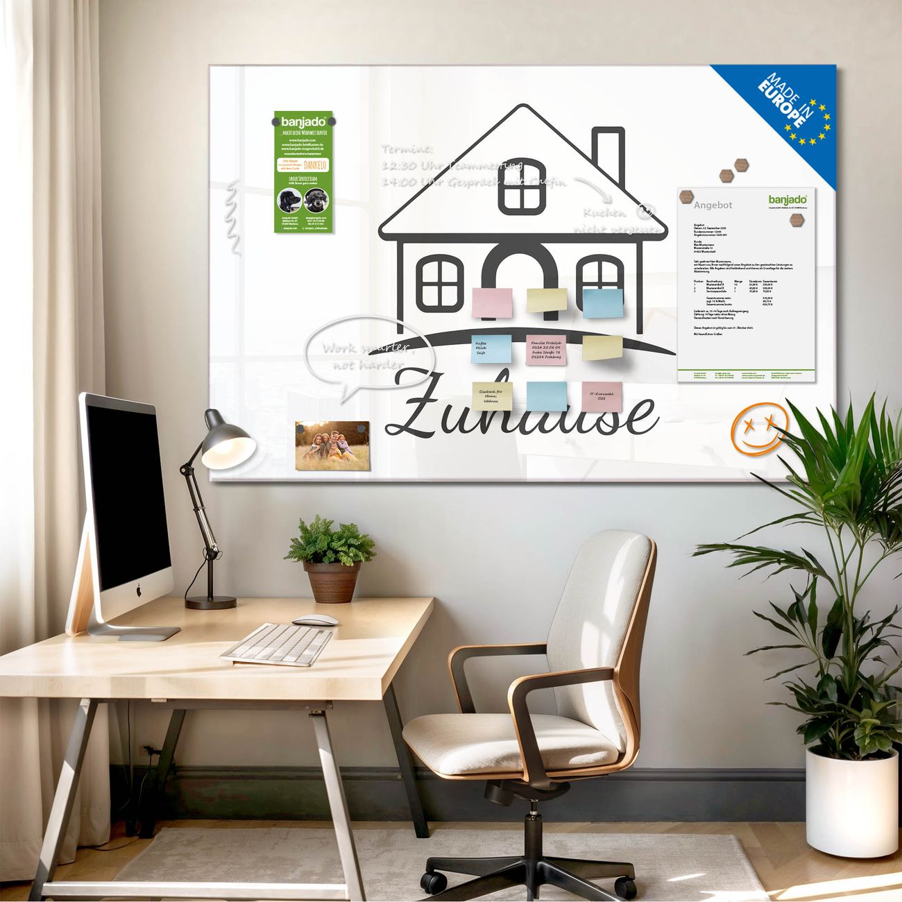 Die banjado Glas Magnettafel mit dem Motiv Motiv Zuhause 3 verbindet Funktionalität mit Stil. Sie ersetzt das Zettelchaos durch klare Strukturen und bringt dabei eine warme, natürliche Atmosphäre in Ihr Zuhause. Ob im Büro, in der Küche oder im Eingangsbereich - dieses Design-Board zieht Blicke an und sorgt für Ordnung mit Charakter.