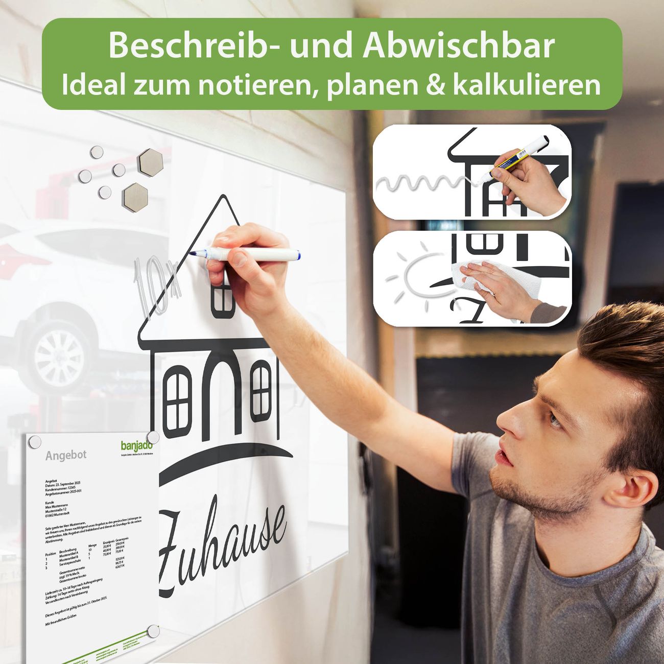 Bitte beachten Sie, dass ausschliessliche spezielle Magnete an der Glastafel haften. Wir empfehlen banjado Neodym Magnete, diese sind durch uns auf Wirksamkeit geprüft.