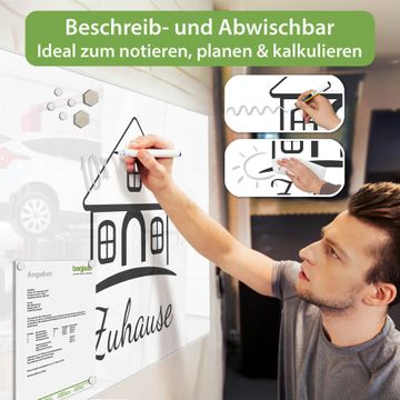 Auf der glatten Glasoberfläche lassen sich Termine, Rezepte oder Notizen ganz einfach mit Kreidestiften festhalten und rückstandslos entfernen. Starke Neodym-Magnete halten Ihre wichtigsten Erinnerungen sicher an Ort und Stelle. So entsteht Ihre ganz persönliche Ideenwand - jeden Tag neu.