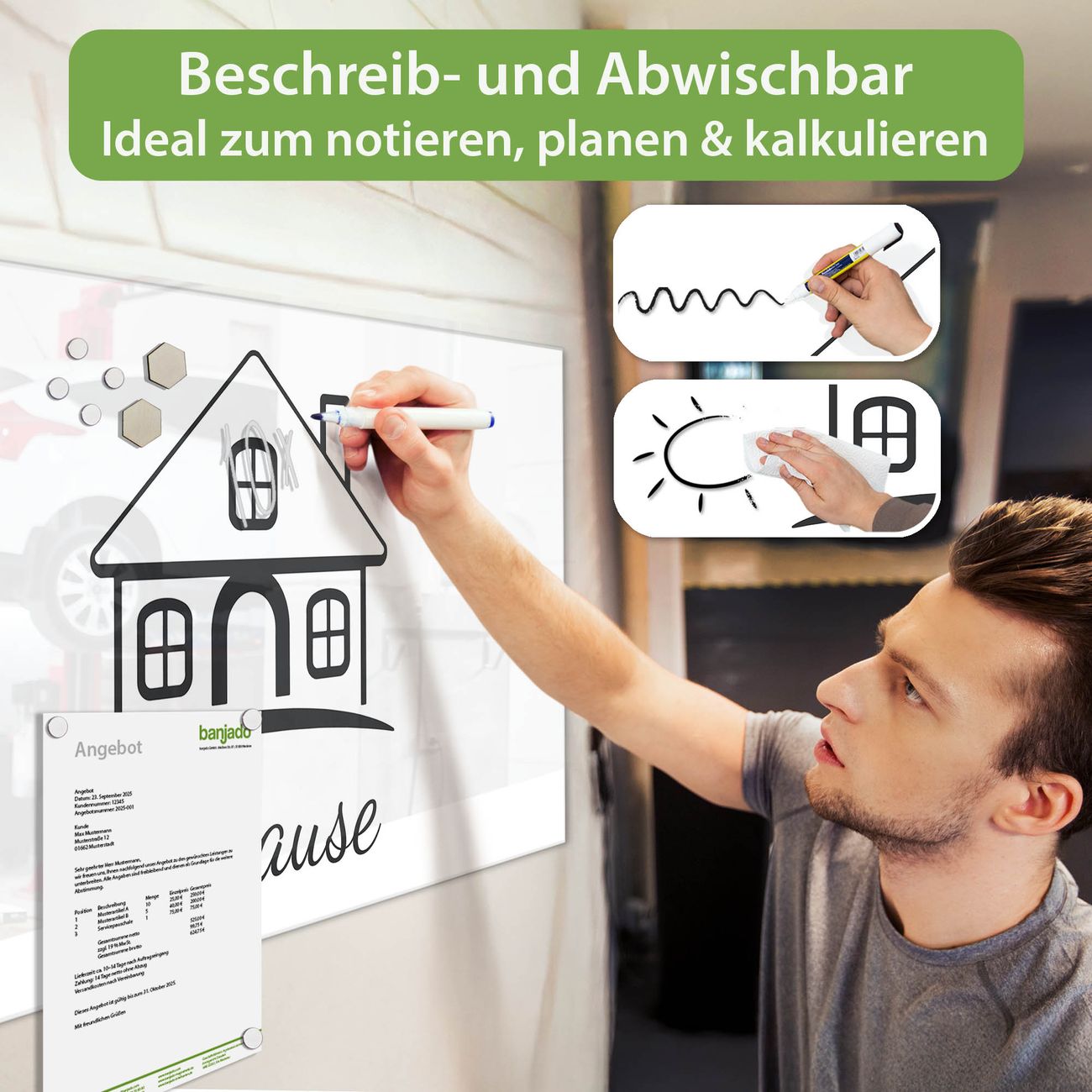 Jede Glas Magnettafel wird in unserer Werkstatt von Hand gefertigt und sorgfältig geprüft. So erhalten Sie ein echtes Qualitätsprodukt, das Funktion und Ästhetik perfekt vereint.?? Warum banjado?