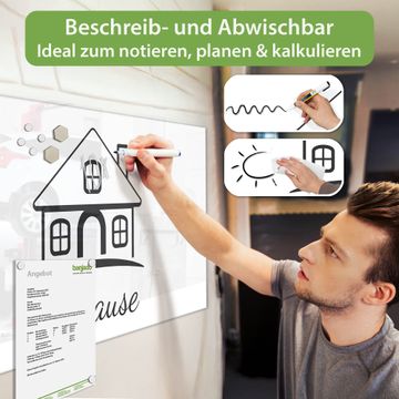 Auf der glatten Glasoberfläche lassen sich Termine, Rezepte oder Notizen ganz einfach mit Kreidestiften festhalten und rückstandslos entfernen. Starke Neodym-Magnete halten Ihre wichtigsten Erinnerungen sicher an Ort und Stelle. So entsteht Ihre ganz persönliche Ideenwand - jeden Tag neu.