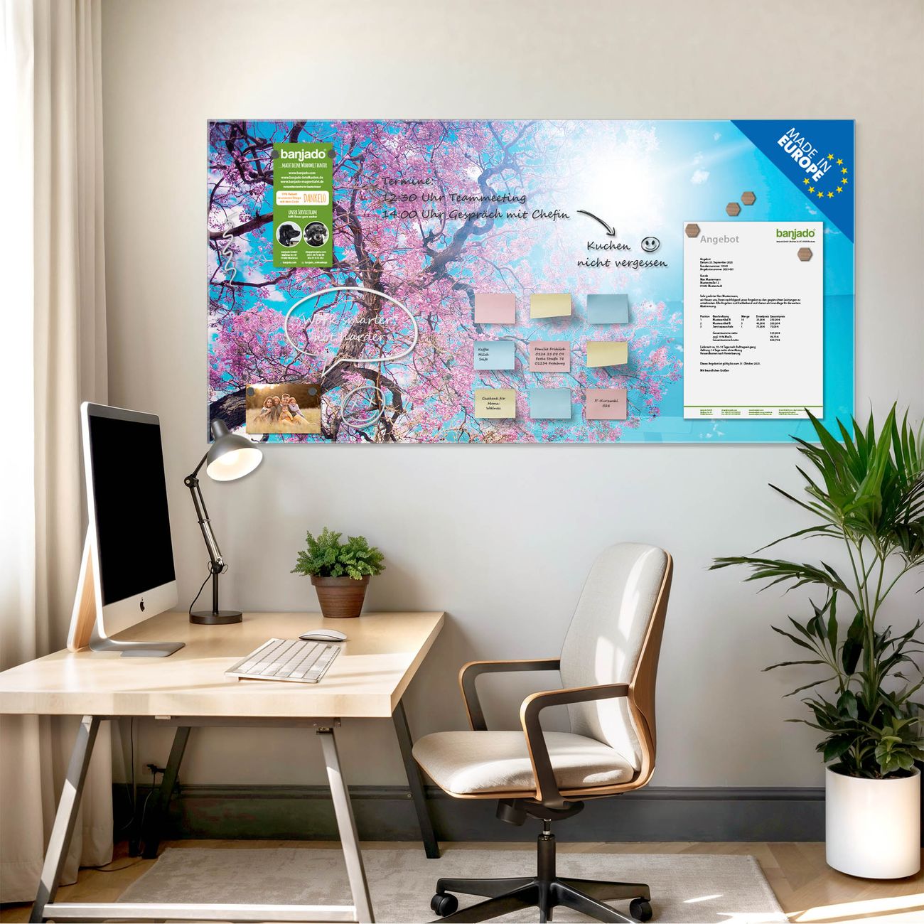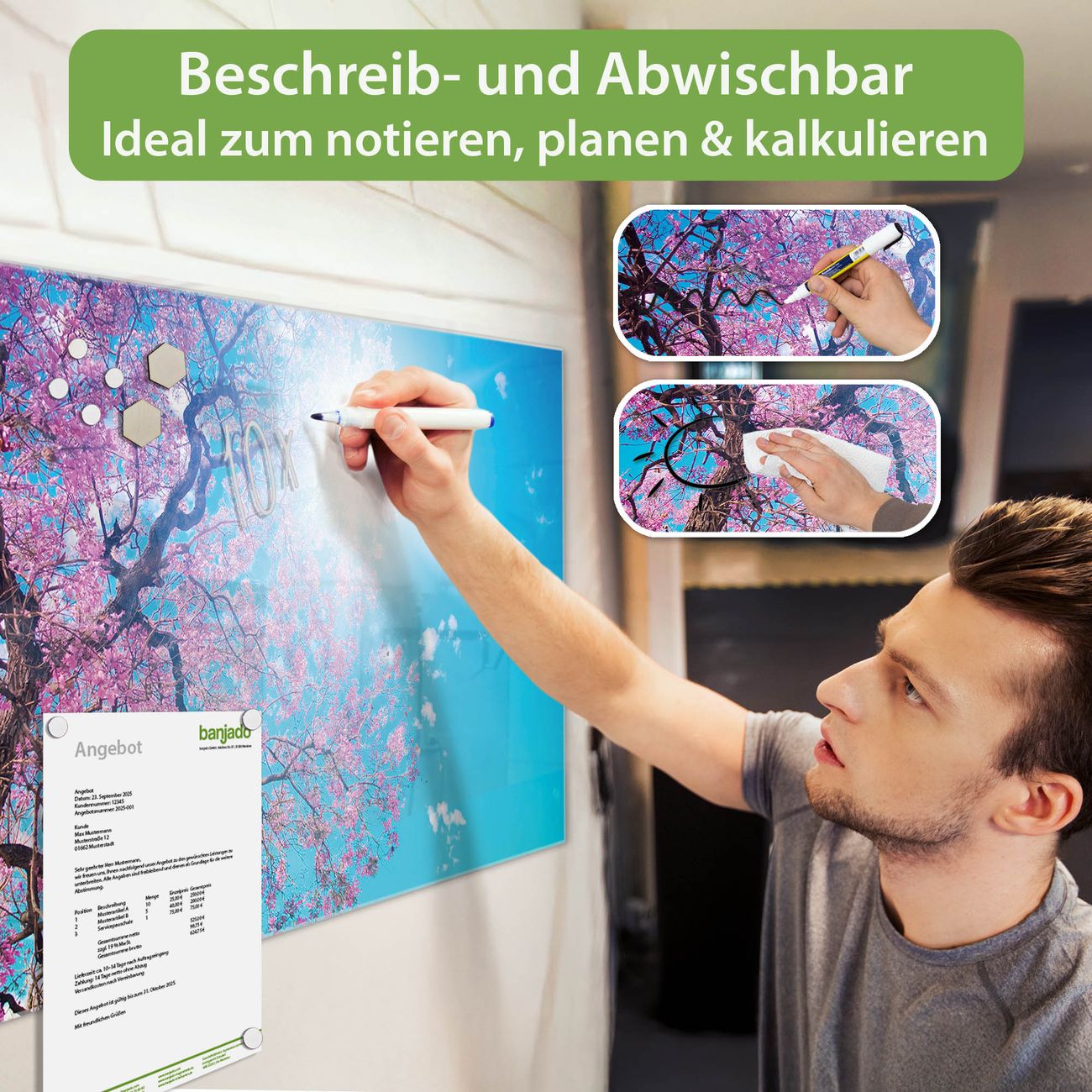Jede Glas Magnettafel wird in unserer Werkstatt von Hand gefertigt und sorgfältig geprüft. So erhalten Sie ein echtes Qualitätsprodukt, das Funktion und Ästhetik perfekt vereint.?? Warum banjado?