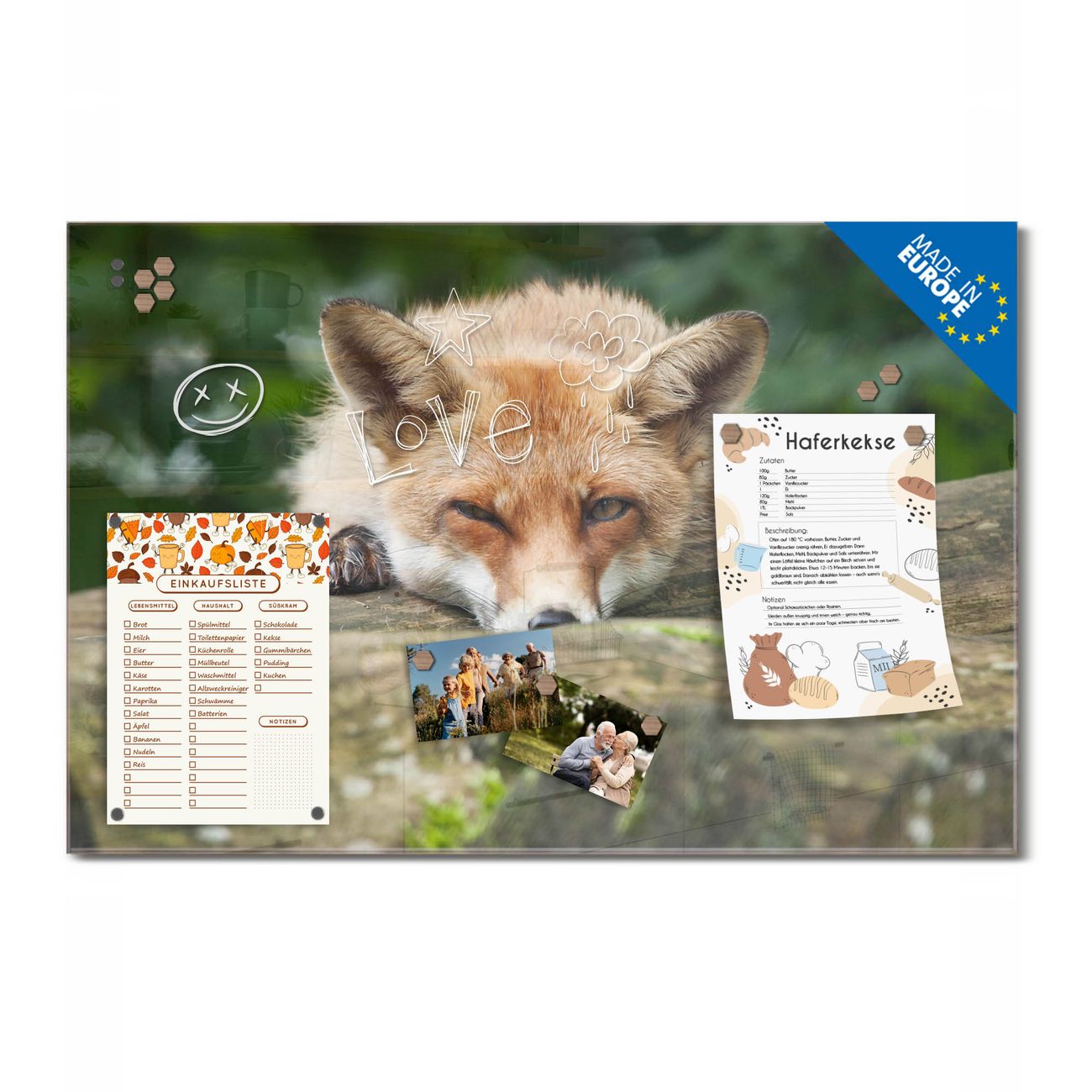 Ein Stück Design, das Ihren Alltag organisiert. Schreiben, heften, inspirieren - alles an einem Ort. Qualität, die man spürt. Montage leicht gemacht. Handwerk mit Herz - veredelt in Sachsen. Einzigartiges Design mit Motiv Motiv Fuchs Relax Beschreibbare Glasoberfläche, leicht zu reinigen Starke Magnetkraft durch Stahlrückwand Inklusive 4 Neodym-Magneten Flexible Montageoptionen Handveredelt in Sachsen - Qualität, die bleibt