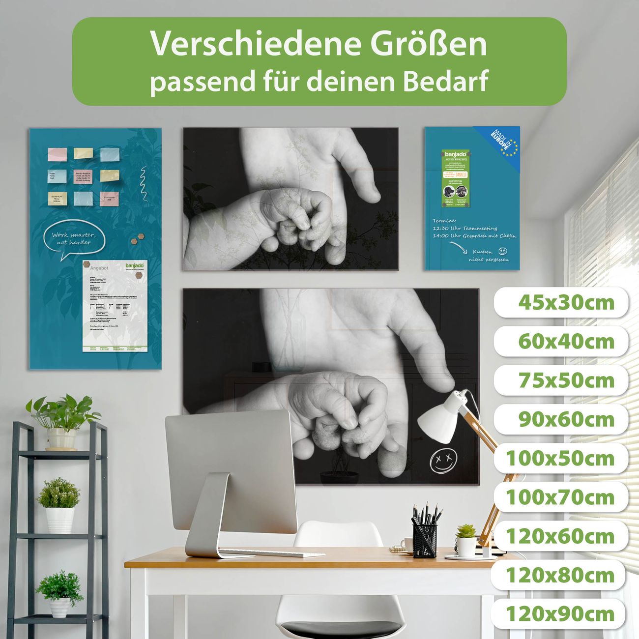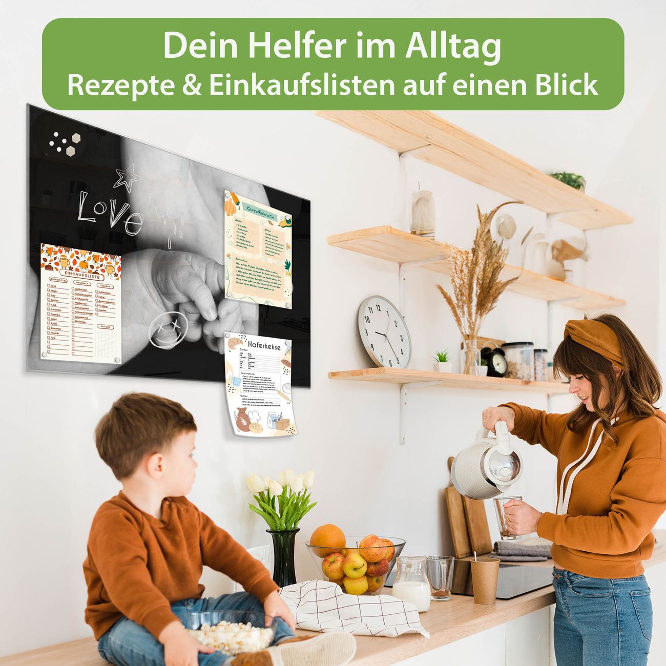Auf der glatten Glasoberfläche lassen sich Termine, Rezepte oder Notizen ganz einfach mit Kreidestiften festhalten und rückstandslos entfernen. Starke Neodym-Magnete halten Ihre wichtigsten Erinnerungen sicher an Ort und Stelle. So entsteht Ihre ganz persönliche Ideenwand - jeden Tag neu.