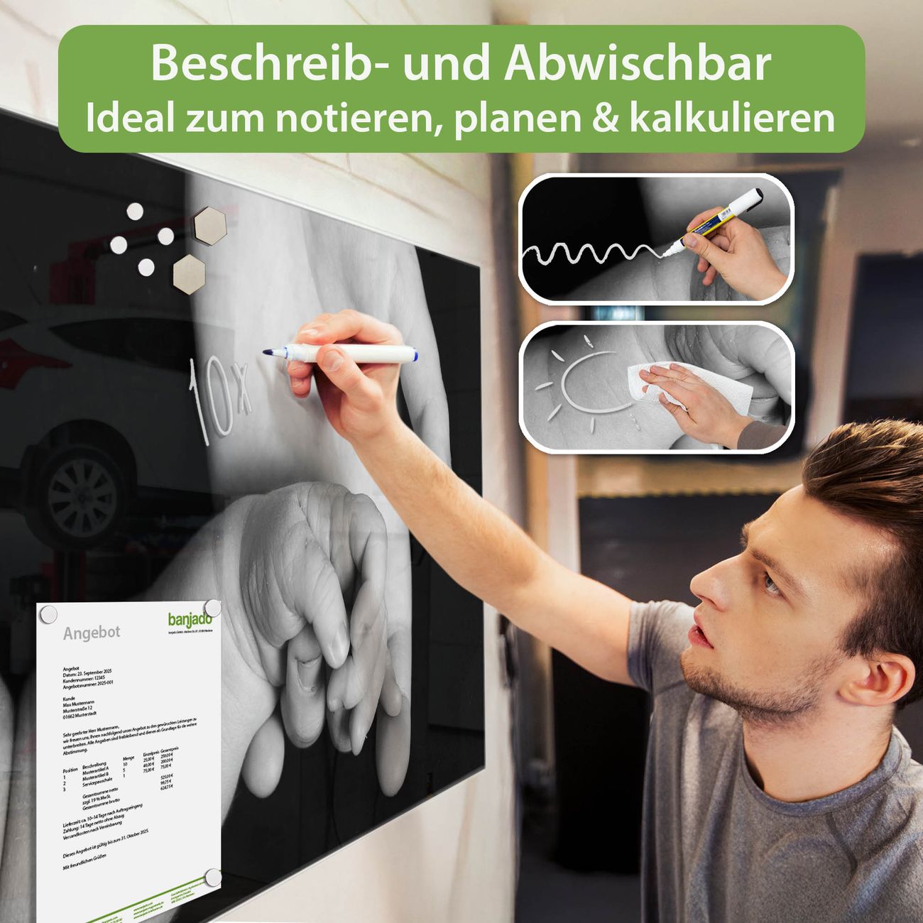 Bitte beachten Sie, dass ausschliessliche spezielle Magnete an der Glastafel haften. Wir empfehlen banjado Neodym Magnete, diese sind durch uns auf Wirksamkeit geprüft.