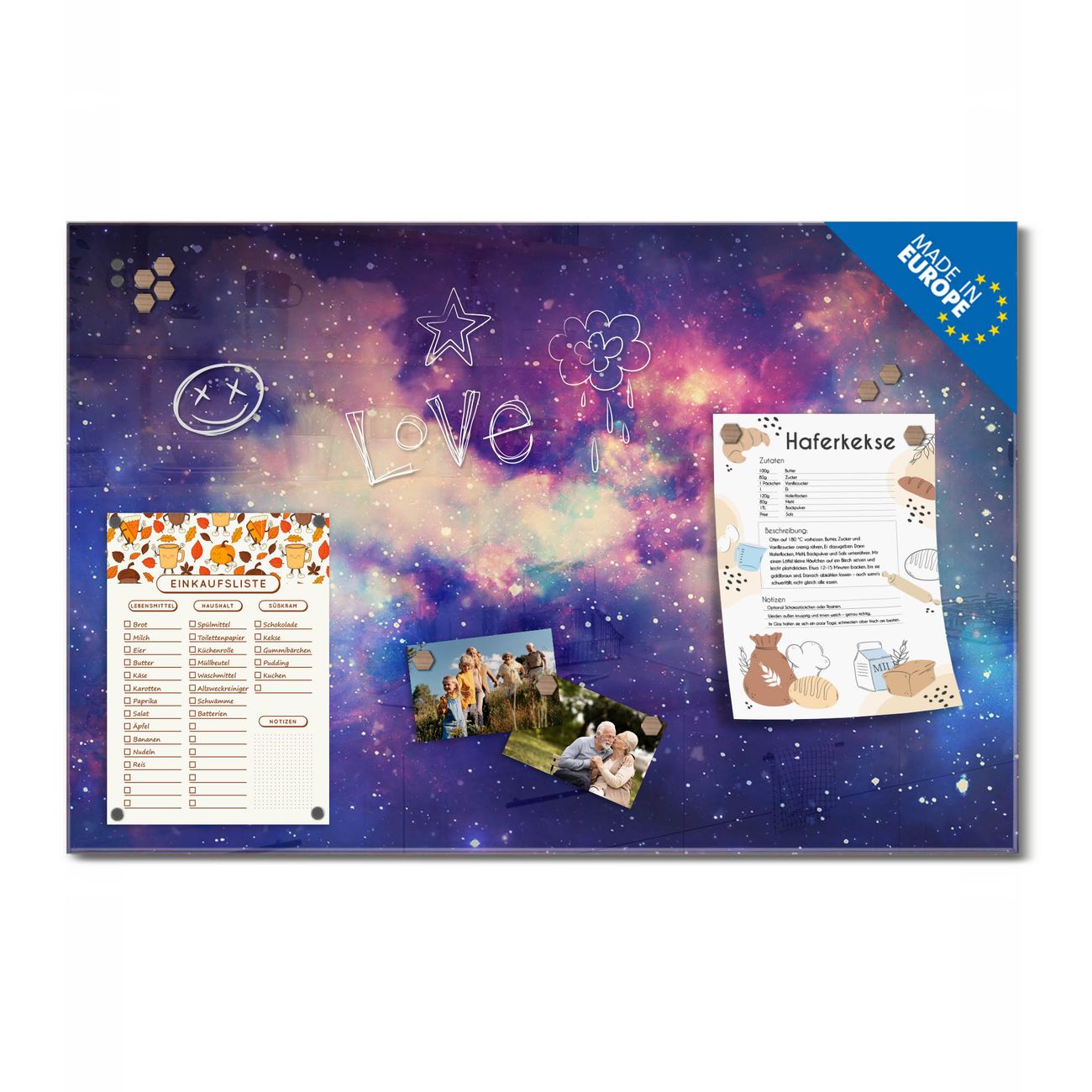 Ein Stück Design, das Ihren Alltag organisiert. Schreiben, heften, inspirieren - alles an einem Ort. Qualität, die man spürt. Montage leicht gemacht. Handwerk mit Herz - veredelt in Sachsen. Einzigartiges Design mit Motiv Motiv Im Weltall 1 Beschreibbare Glasoberfläche, leicht zu reinigen Starke Magnetkraft durch Stahlrückwand Inklusive 4 Neodym-Magneten Flexible Montageoptionen Handveredelt in Sachsen - Qualität, die bleibt