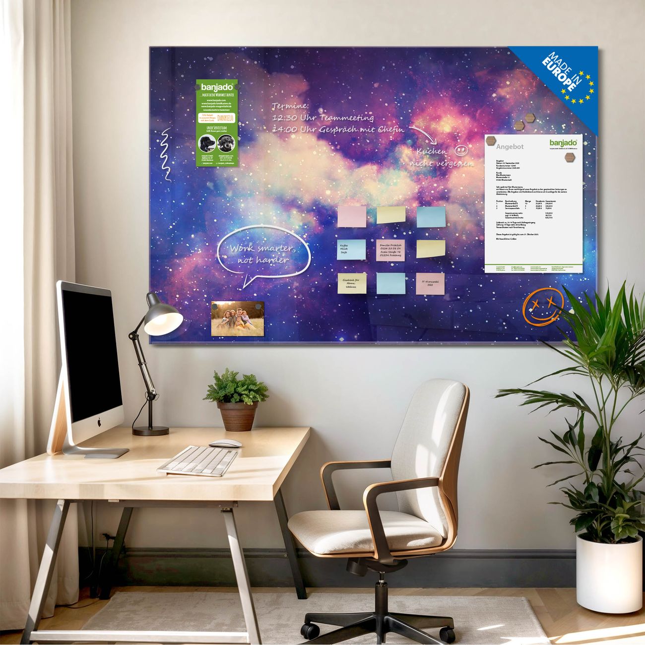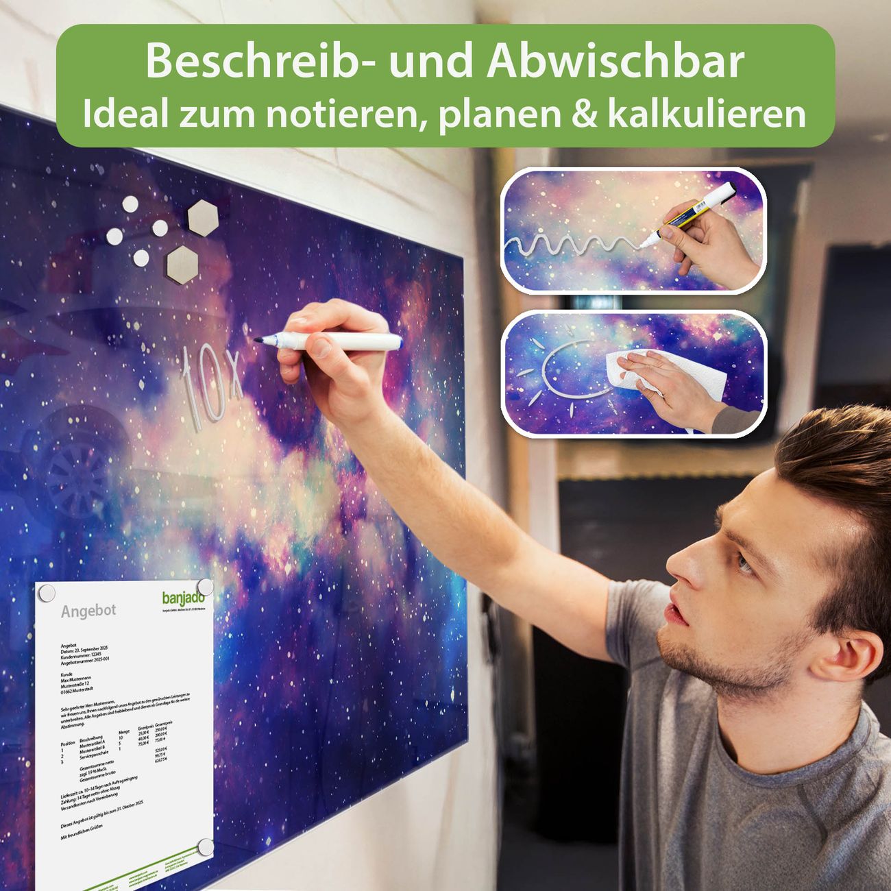 Jede Glas Magnettafel wird in unserer Werkstatt von Hand gefertigt und sorgfältig geprüft. So erhalten Sie ein echtes Qualitätsprodukt, das Funktion und Ästhetik perfekt vereint.?? Warum banjado?