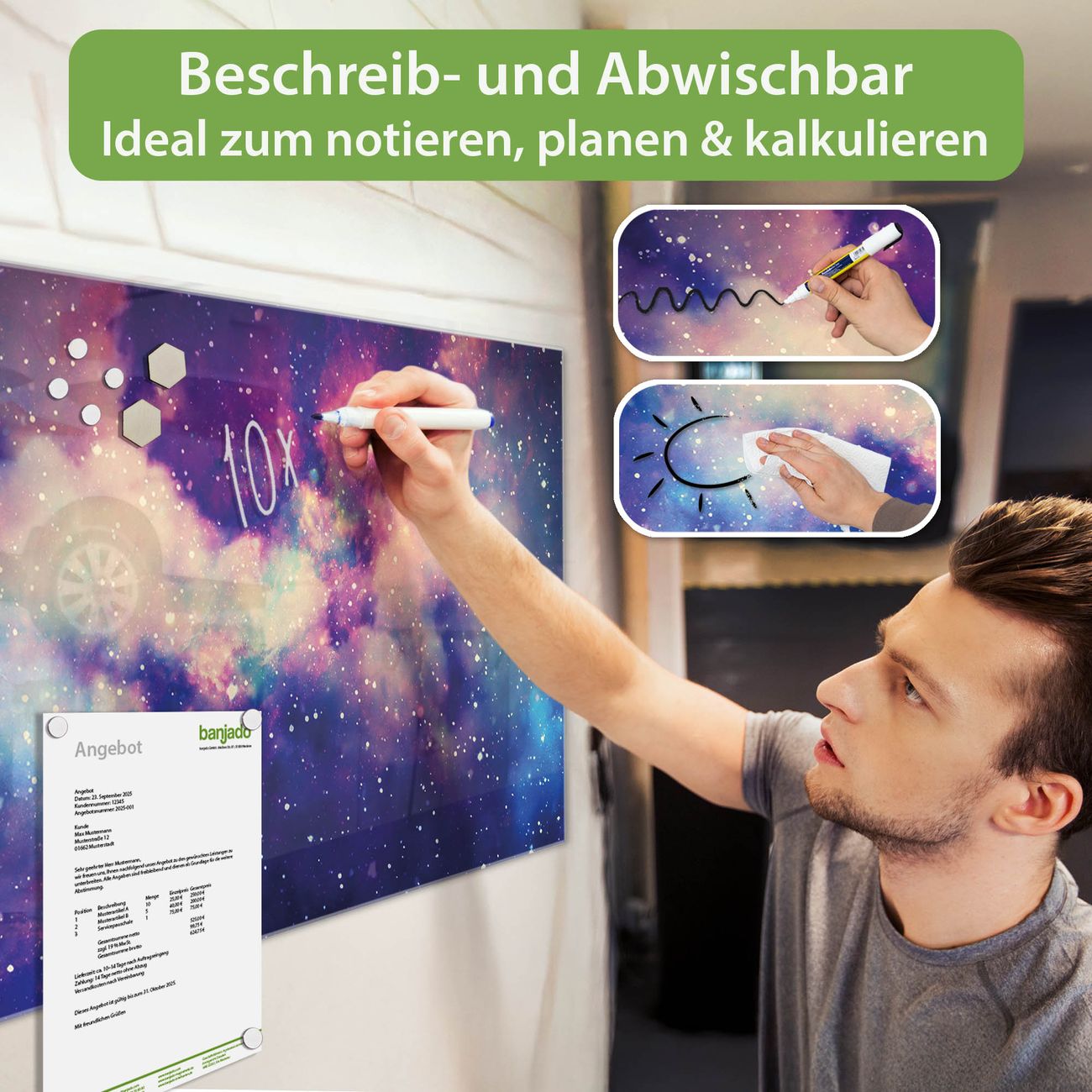 Jede Glas Magnettafel wird in unserer Werkstatt von Hand gefertigt und sorgfältig geprüft. So erhalten Sie ein echtes Qualitätsprodukt, das Funktion und Ästhetik perfekt vereint.?? Warum banjado?