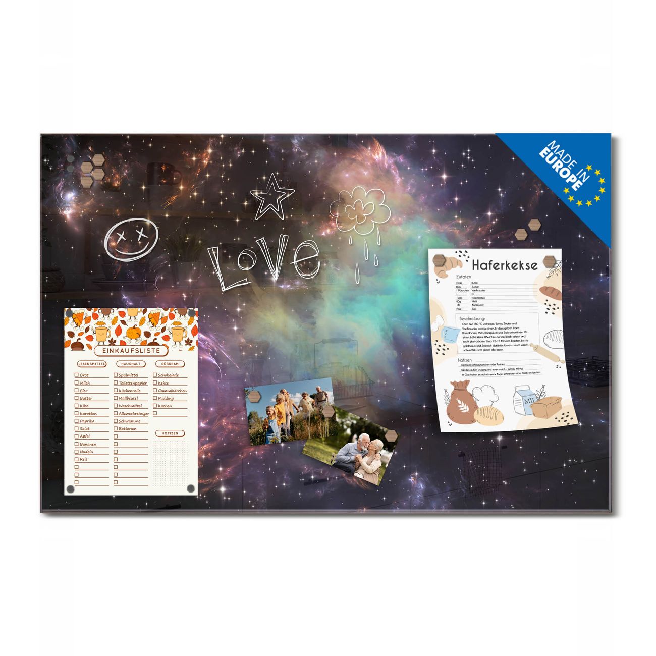 Ein Stück Design, das Ihren Alltag organisiert. Schreiben, heften, inspirieren - alles an einem Ort. Qualität, die man spürt. Montage leicht gemacht. Handwerk mit Herz - veredelt in Sachsen. Einzigartiges Design mit Motiv Motiv Im Weltall 2 Beschreibbare Glasoberfläche, leicht zu reinigen Starke Magnetkraft durch Stahlrückwand Inklusive 4 Neodym-Magneten Flexible Montageoptionen Handveredelt in Sachsen - Qualität, die bleibt