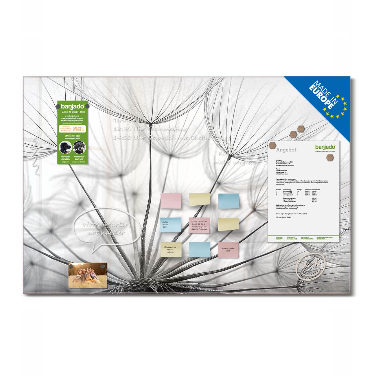 Jede Glas Magnettafel wird in unserer Werkstatt von Hand gefertigt und sorgfältig geprüft. So erhalten Sie ein echtes Qualitätsprodukt, das Funktion und Ästhetik perfekt vereint.?? Warum banjado?