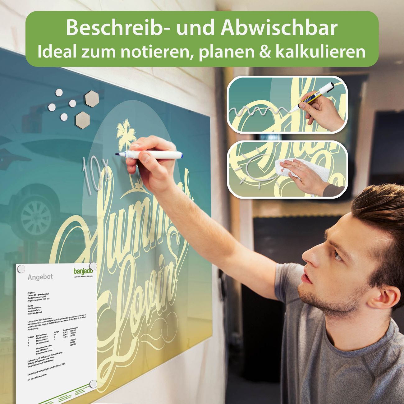 Jede Glas Magnettafel wird in unserer Werkstatt von Hand gefertigt und sorgfältig geprüft. So erhalten Sie ein echtes Qualitätsprodukt, das Funktion und Ästhetik perfekt vereint.?? Warum banjado?