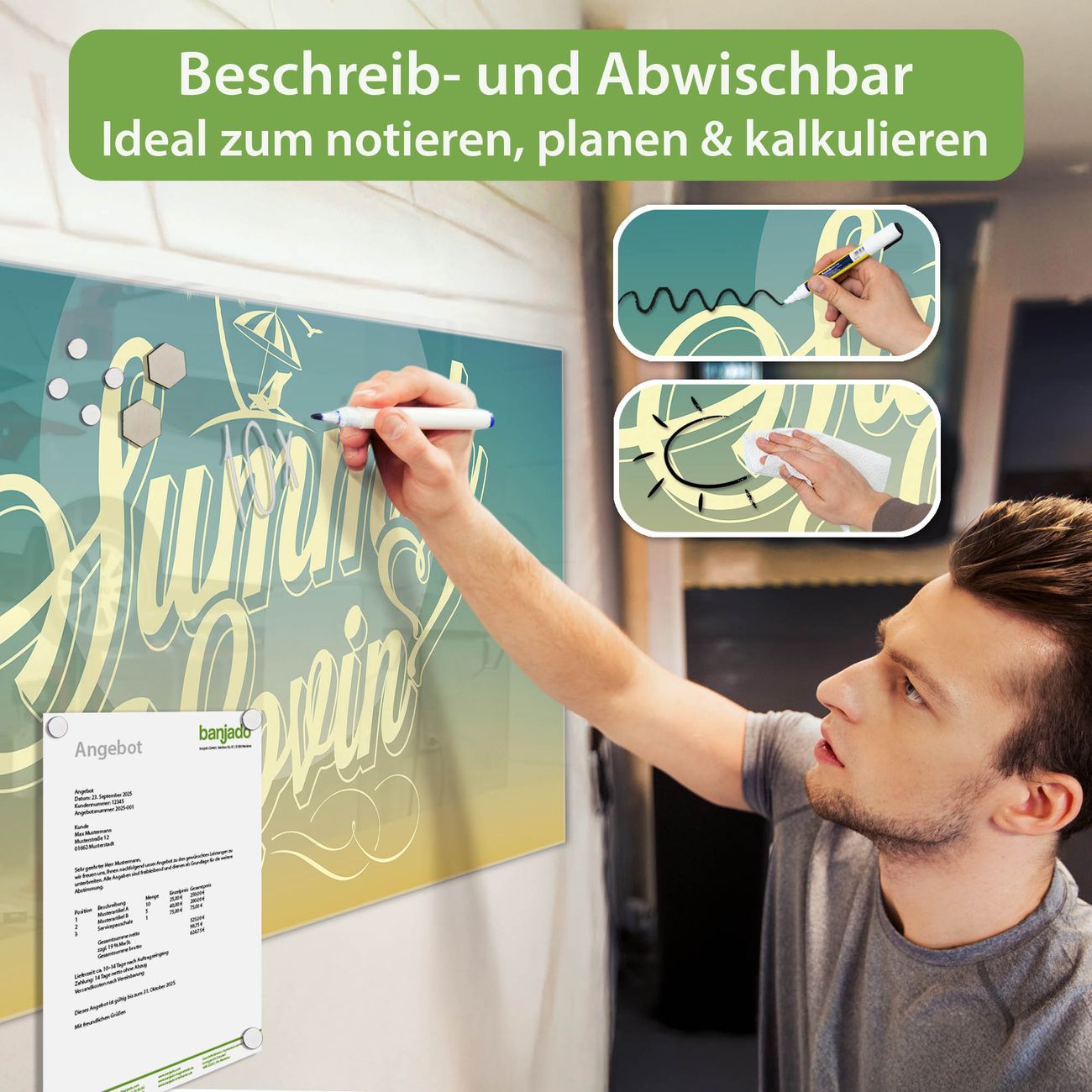 Auf der glatten Glasoberfläche lassen sich Termine, Rezepte oder Notizen ganz einfach mit Kreidestiften festhalten und rückstandslos entfernen. Starke Neodym-Magnete halten Ihre wichtigsten Erinnerungen sicher an Ort und Stelle. So entsteht Ihre ganz persönliche Ideenwand - jeden Tag neu.