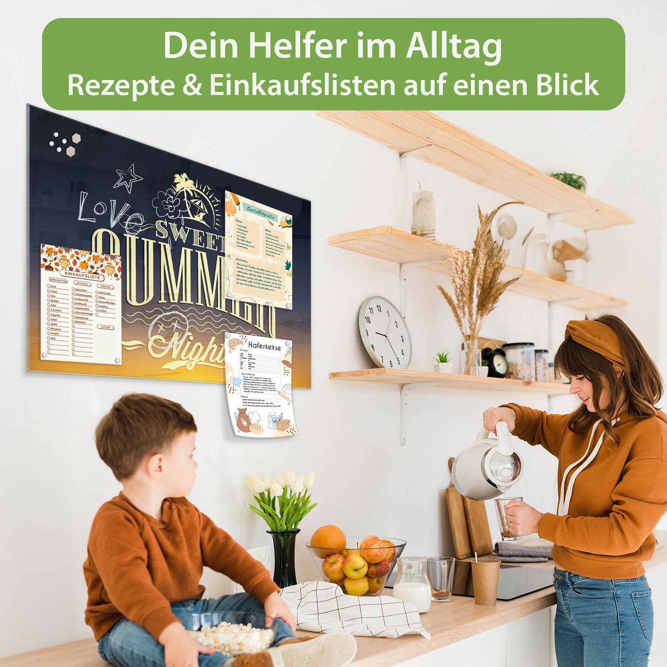 Auf der glatten Glasoberfläche lassen sich Termine, Rezepte oder Notizen ganz einfach mit Kreidestiften festhalten und rückstandslos entfernen. Starke Neodym-Magnete halten Ihre wichtigsten Erinnerungen sicher an Ort und Stelle. So entsteht Ihre ganz persönliche Ideenwand - jeden Tag neu.