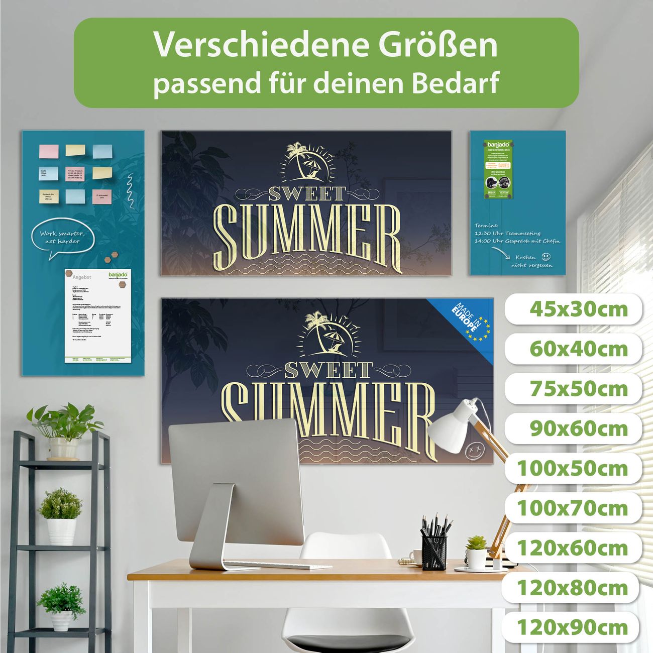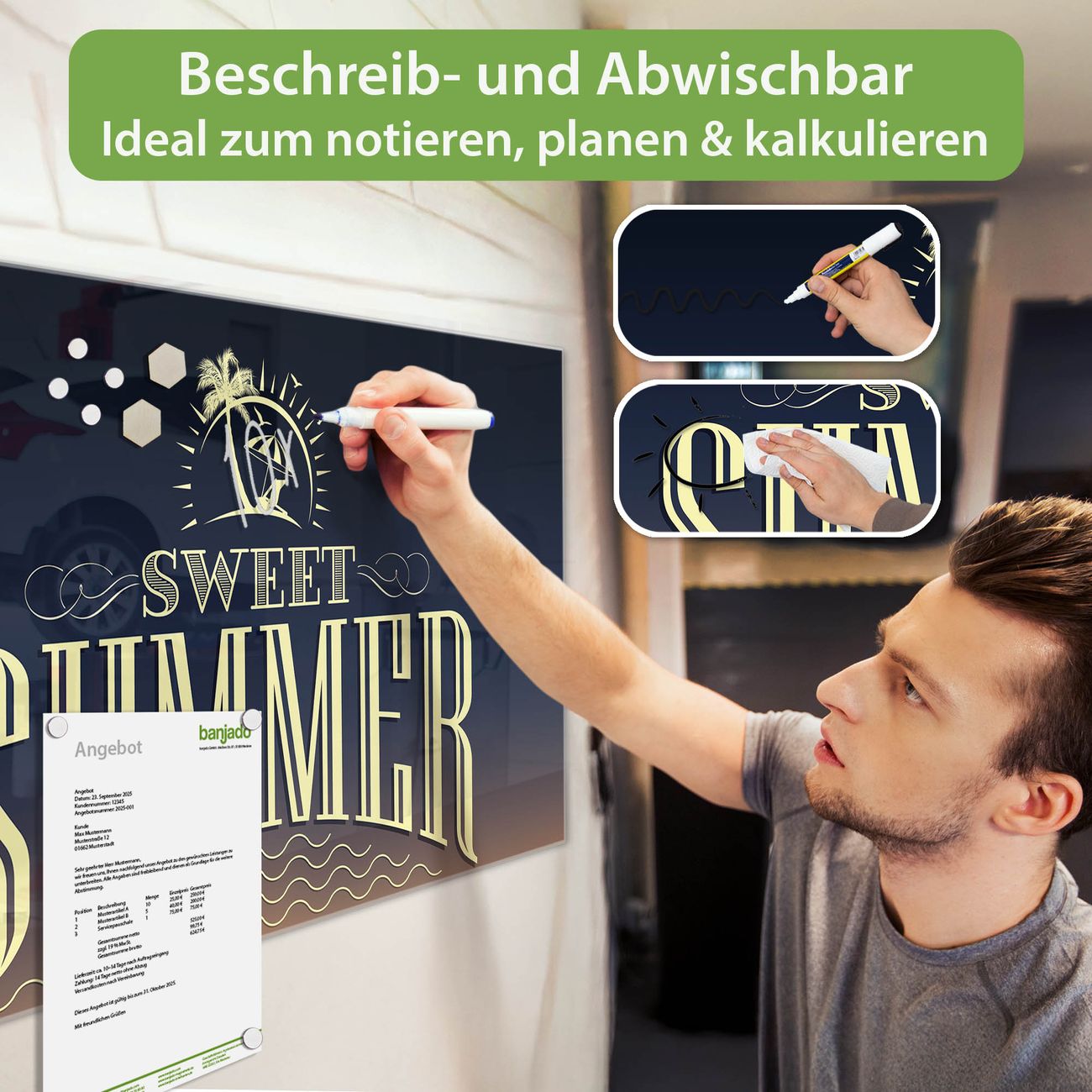 Jede Glas Magnettafel wird in unserer Werkstatt von Hand gefertigt und sorgfältig geprüft. So erhalten Sie ein echtes Qualitätsprodukt, das Funktion und Ästhetik perfekt vereint.?? Warum banjado?
