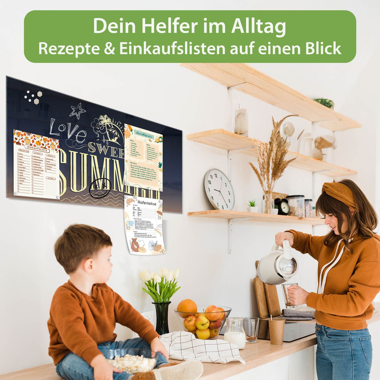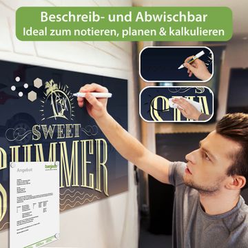 Auf der glatten Glasoberfläche lassen sich Termine, Rezepte oder Notizen ganz einfach mit Kreidestiften festhalten und rückstandslos entfernen. Starke Neodym-Magnete halten Ihre wichtigsten Erinnerungen sicher an Ort und Stelle. So entsteht Ihre ganz persönliche Ideenwand - jeden Tag neu.