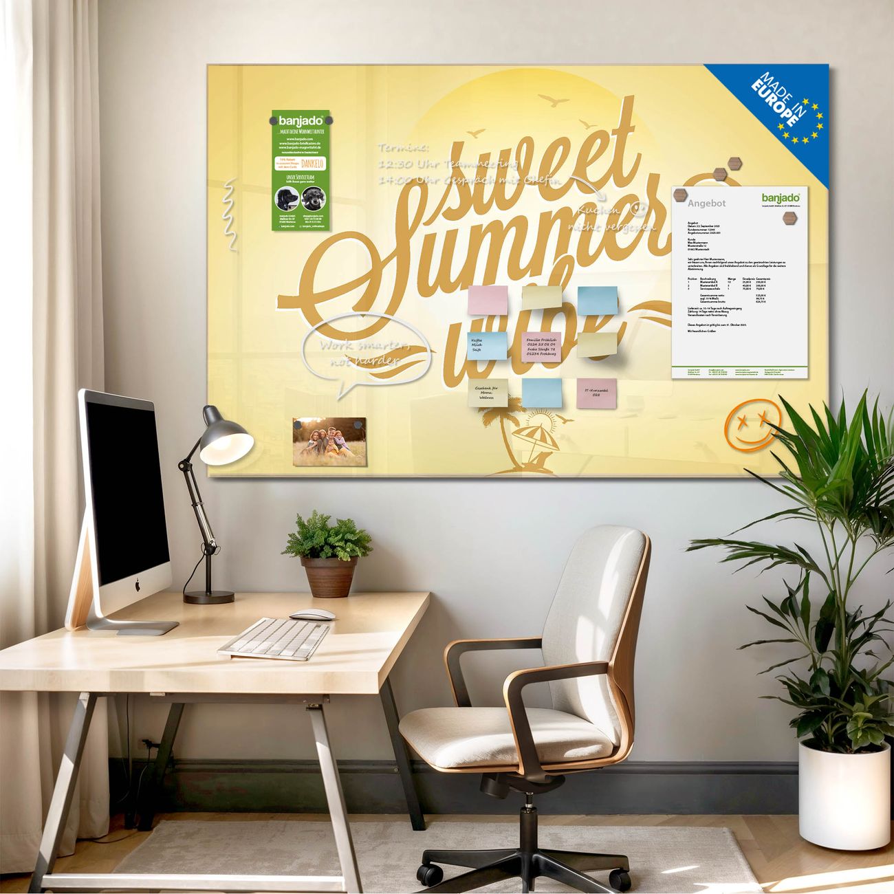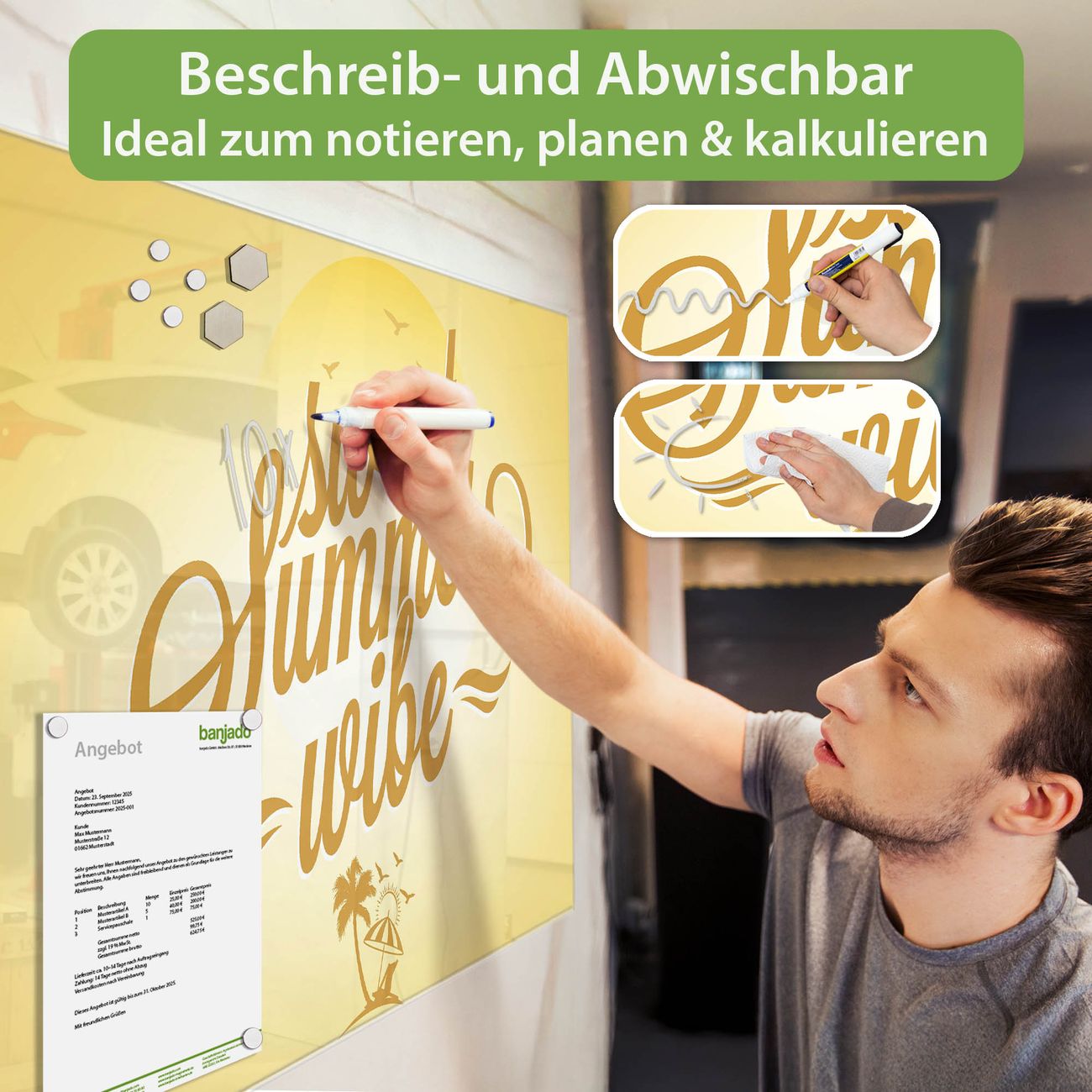Die banjado Glas Magnettafel mit dem Motiv Motiv Summer Wibe verbindet Funktionalität mit Stil. Sie ersetzt das Zettelchaos durch klare Strukturen und bringt dabei eine warme, natürliche Atmosphäre in Ihr Zuhause. Ob im Büro, in der Küche oder im Eingangsbereich - dieses Design-Board zieht Blicke an und sorgt für Ordnung mit Charakter.