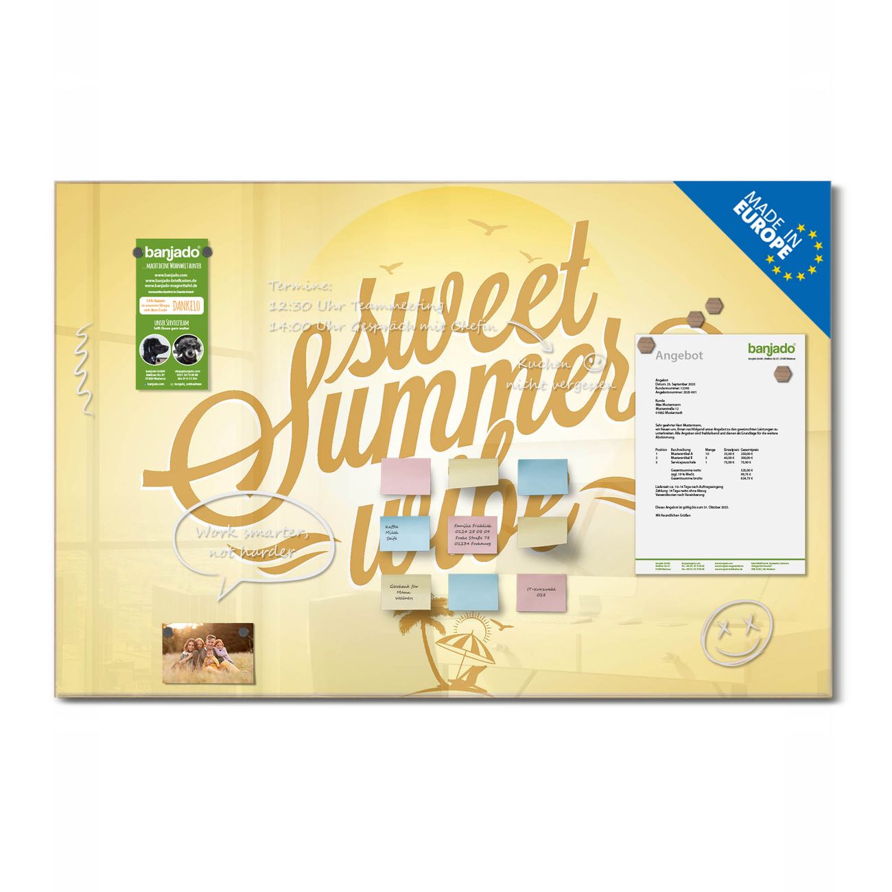 Ein Stück Design, das Ihren Alltag organisiert. Schreiben, heften, inspirieren - alles an einem Ort. Qualität, die man spürt. Montage leicht gemacht. Handwerk mit Herz - veredelt in Sachsen. Einzigartiges Design mit Motiv Motiv Summer Wibe Beschreibbare Glasoberfläche, leicht zu reinigen Starke Magnetkraft durch Stahlrückwand Inklusive 4 Neodym-Magneten Flexible Montageoptionen Handveredelt in Sachsen - Qualität, die bleibt