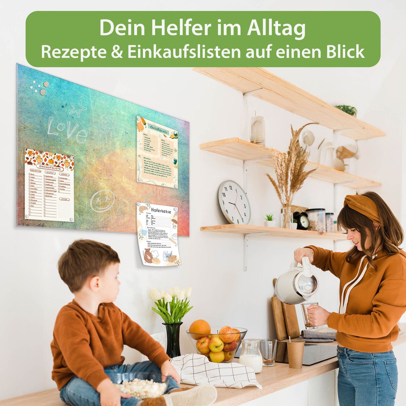 Auf der glatten Glasoberfläche lassen sich Termine, Rezepte oder Notizen ganz einfach mit Kreidestiften festhalten und rückstandslos entfernen. Starke Neodym-Magnete halten Ihre wichtigsten Erinnerungen sicher an Ort und Stelle. So entsteht Ihre ganz persönliche Ideenwand - jeden Tag neu.