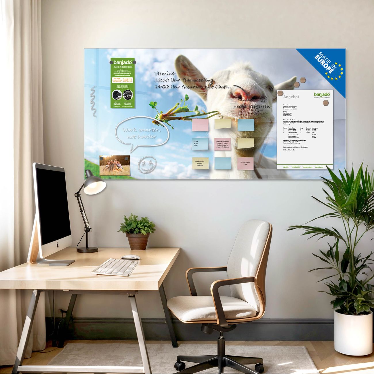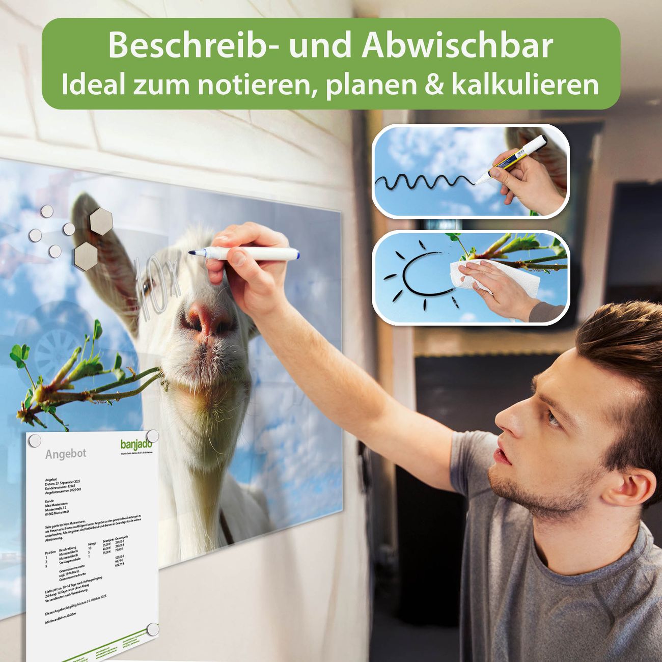 Die banjado Glas Magnettafel mit dem Motiv Motiv Ziege 2 verbindet Funktionalität mit Stil. Sie ersetzt das Zettelchaos durch klare Strukturen und bringt dabei eine warme, natürliche Atmosphäre in Ihr Zuhause. Ob im Büro, in der Küche oder im Eingangsbereich - dieses Design-Board zieht Blicke an und sorgt für Ordnung mit Charakter.
