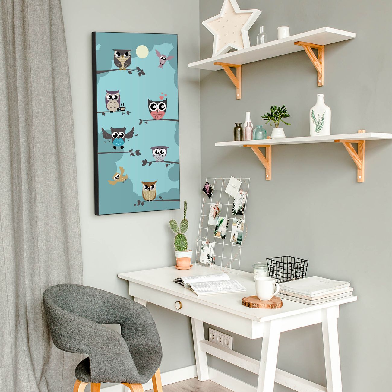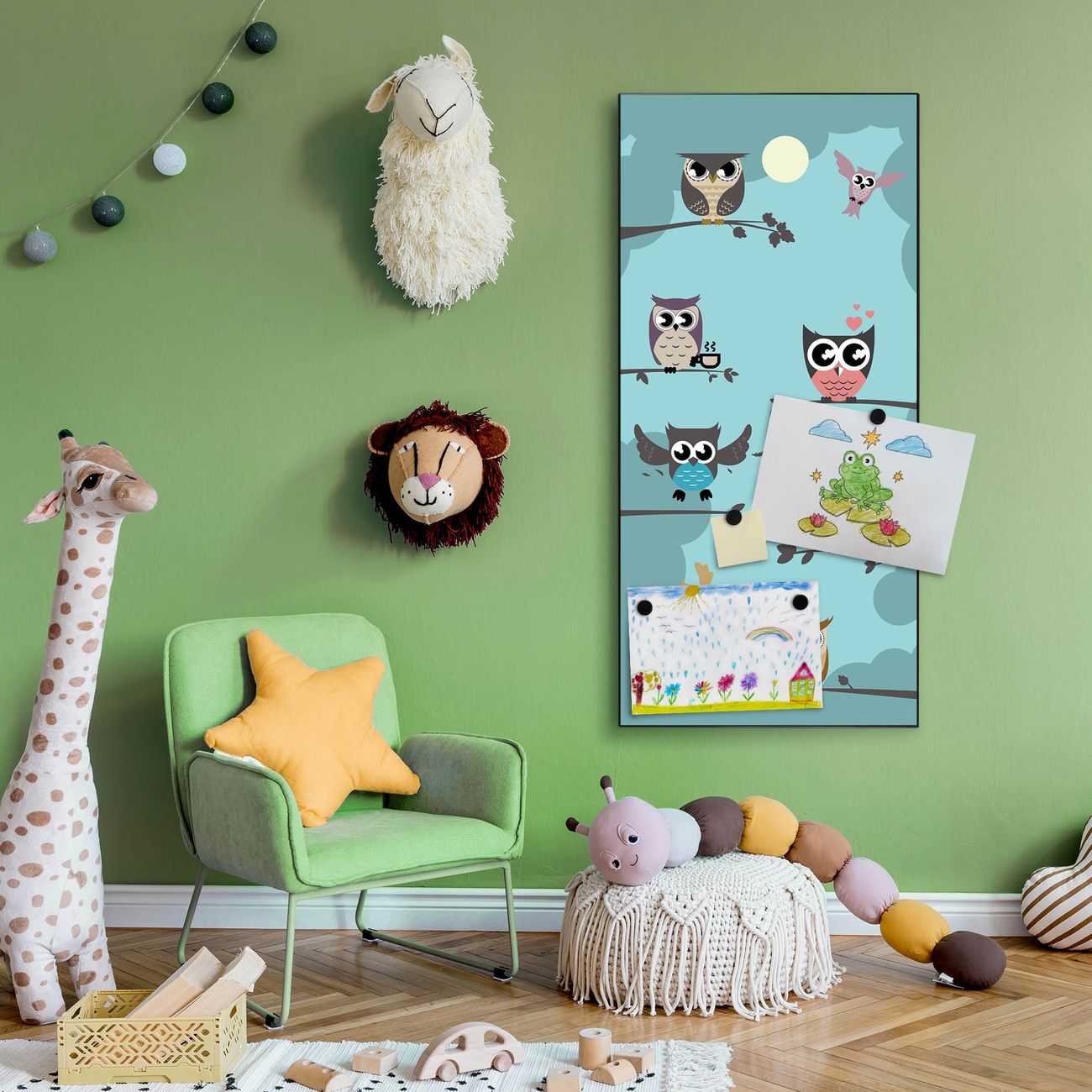 FUNKTION:  Die banjado Magnettafel mit Motiv Acht Eulen Motiv bringt Ordnung in Ihr Zettelchaos. Fotos, Termine, Notizen oder Rezepte lassen Sich hier stilvoll mit Magneten ordnen, Sie behalten alles im Blick. An der Design Magnettafel halten alle handesüblichen Magnete. DESIGN:  Die magnetische Pinnwand mit dem Motiv Motiv Acht Eulen ist ein eleganter Begleiter im Alltag. Mit dieser Memotafel aus Metall haben Sie auch ohne Notizen und Magnete ein schönes Dekoelement. Das Format bietet Ihnen ausreichend Platz um alle wichtigen Informationen im Blick zu behalten. DETAILS:  Die Magnettafel besteht aus silber-grau, weiß oder schwarzlackiertem Stahl. Sie hat eine Größe von 37 x 78 x 2cm. Es befinden sich auf der Rückseite vorgefertigte Aufhängungen die eine schnelle und unkomplizierte Anbringung ermöglichen. Das Motiv ist mit einem seidenmatten Laminat versehen und schützt so zusätzlich vor Kratzern. NUTZEN:  Sie können dieses Memoboard groß als Wandbild nutzen, es halten alle handelsüblichen Magneten daran. Die Pinnwand ist mit einem feuchten Lappen oder Schwamm abwischbar. Sie finden bei uns eine große Auswahl an passenden Magneten. BANJADO:  Wir sind ein kleines Team aus dem Herzen von Sachsen. Wir fertigen alle Artikel von Hand für Sie an, Sie erhalten keine preiswerte Importware. Auf Wunsch können Sie auch Ihr eigenes Foto auf die Magnettafel aufbringen, schreiben Sie uns an. Herzlichst, Ihr banjado-Team