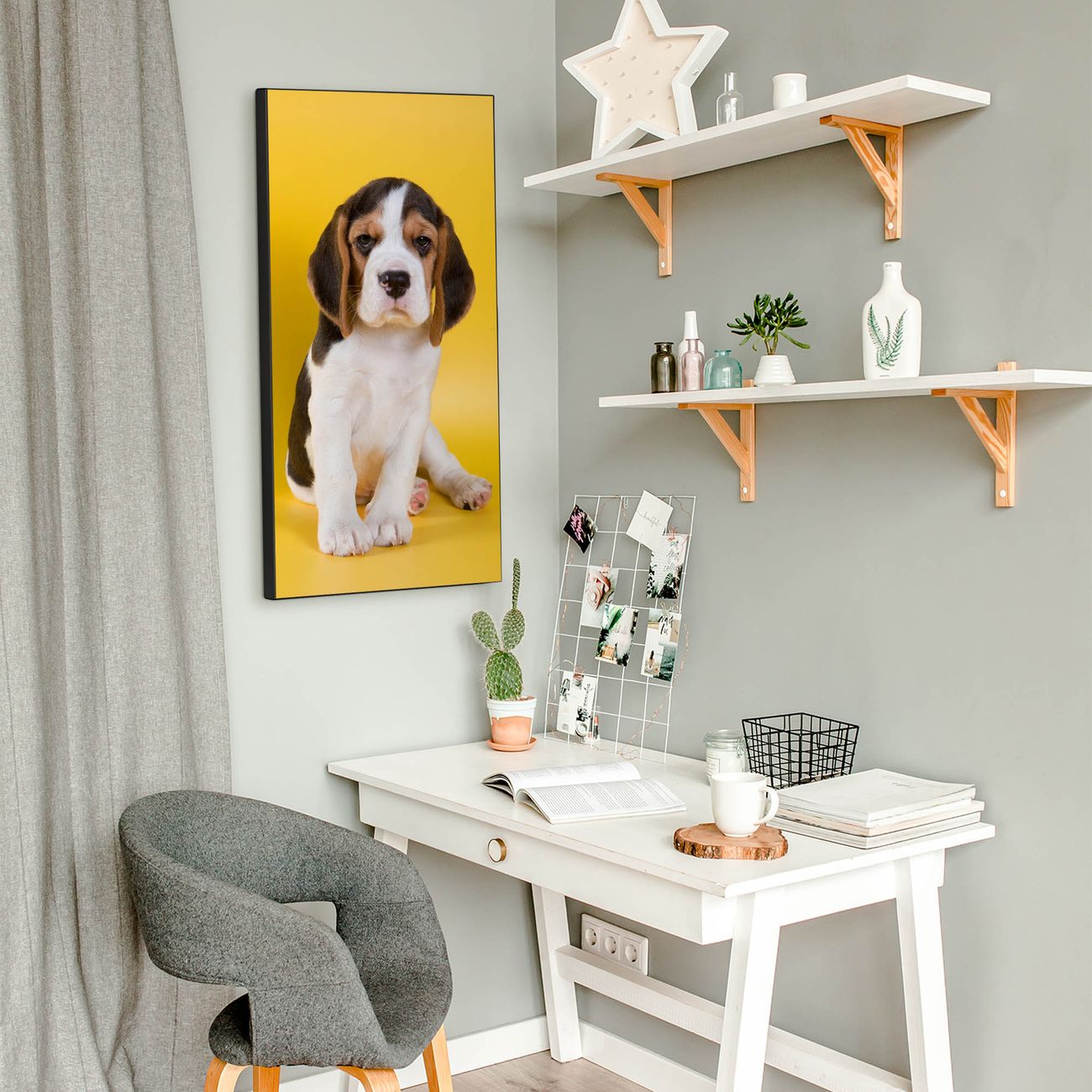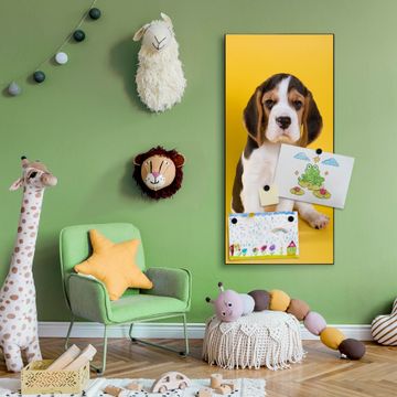 FUNKTION:  Die banjado Magnettafel mit Motiv Beagle Motiv bringt Ordnung in Ihr Zettelchaos. Fotos, Termine, Notizen oder Rezepte lassen Sich hier stilvoll mit Magneten ordnen, Sie behalten alles im Blick. An der Design Magnettafel halten alle handesüblichen Magnete. DESIGN:  Die magnetische Pinnwand mit dem Motiv Motiv Beagle ist ein eleganter Begleiter im Alltag. Mit dieser Memotafel aus Metall haben Sie auch ohne Notizen und Magnete ein schönes Dekoelement. Das Format bietet Ihnen ausreichend Platz um alle wichtigen Informationen im Blick zu behalten. DETAILS:  Die Magnettafel besteht aus silber-grau, weiß oder schwarzlackiertem Stahl. Sie hat eine Größe von 37 x 78 x 2cm. Es befinden sich auf der Rückseite vorgefertigte Aufhängungen die eine schnelle und unkomplizierte Anbringung ermöglichen. Das Motiv ist mit einem seidenmatten Laminat versehen und schützt so zusätzlich vor Kratzern. NUTZEN:  Sie können dieses Memoboard groß als Wandbild nutzen, es halten alle handelsüblichen Magneten daran. Die Pinnwand ist mit einem feuchten Lappen oder Schwamm abwischbar. Sie finden bei uns eine große Auswahl an passenden Magneten. BANJADO:  Wir sind ein kleines Team aus dem Herzen von Sachsen. Wir fertigen alle Artikel von Hand für Sie an, Sie erhalten keine preiswerte Importware. Auf Wunsch können Sie auch Ihr eigenes Foto auf die Magnettafel aufbringen, schreiben Sie uns an. Herzlichst, Ihr banjado-Team