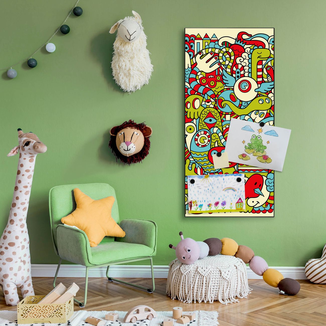 FUNKTION:  Die banjado Magnettafel mit Motiv Birds Worms Freaks Motiv bringt Ordnung in Ihr Zettelchaos. Fotos, Termine, Notizen oder Rezepte lassen Sich hier stilvoll mit Magneten ordnen, Sie behalten alles im Blick. An der Design Magnettafel halten alle handesüblichen Magnete. DESIGN:  Die magnetische Pinnwand mit dem Motiv Motiv Birds Worms Freaks ist ein eleganter Begleiter im Alltag. Mit dieser Memotafel aus Metall haben Sie auch ohne Notizen und Magnete ein schönes Dekoelement. Das Format bietet Ihnen ausreichend Platz um alle wichtigen Informationen im Blick zu behalten. DETAILS:  Die Magnettafel besteht aus silber-grau, weiß oder schwarzlackiertem Stahl. Sie hat eine Größe von 37 x 78 x 2cm. Es befinden sich auf der Rückseite vorgefertigte Aufhängungen die eine schnelle und unkomplizierte Anbringung ermöglichen. Das Motiv ist mit einem seidenmatten Laminat versehen und schützt so zusätzlich vor Kratzern. NUTZEN:  Sie können dieses Memoboard groß als Wandbild nutzen, es halten alle handelsüblichen Magneten daran. Die Pinnwand ist mit einem feuchten Lappen oder Schwamm abwischbar. Sie finden bei uns eine große Auswahl an passenden Magneten. BANJADO:  Wir sind ein kleines Team aus dem Herzen von Sachsen. Wir fertigen alle Artikel von Hand für Sie an, Sie erhalten keine preiswerte Importware. Auf Wunsch können Sie auch Ihr eigenes Foto auf die Magnettafel aufbringen, schreiben Sie uns an. Herzlichst, Ihr banjado-Team