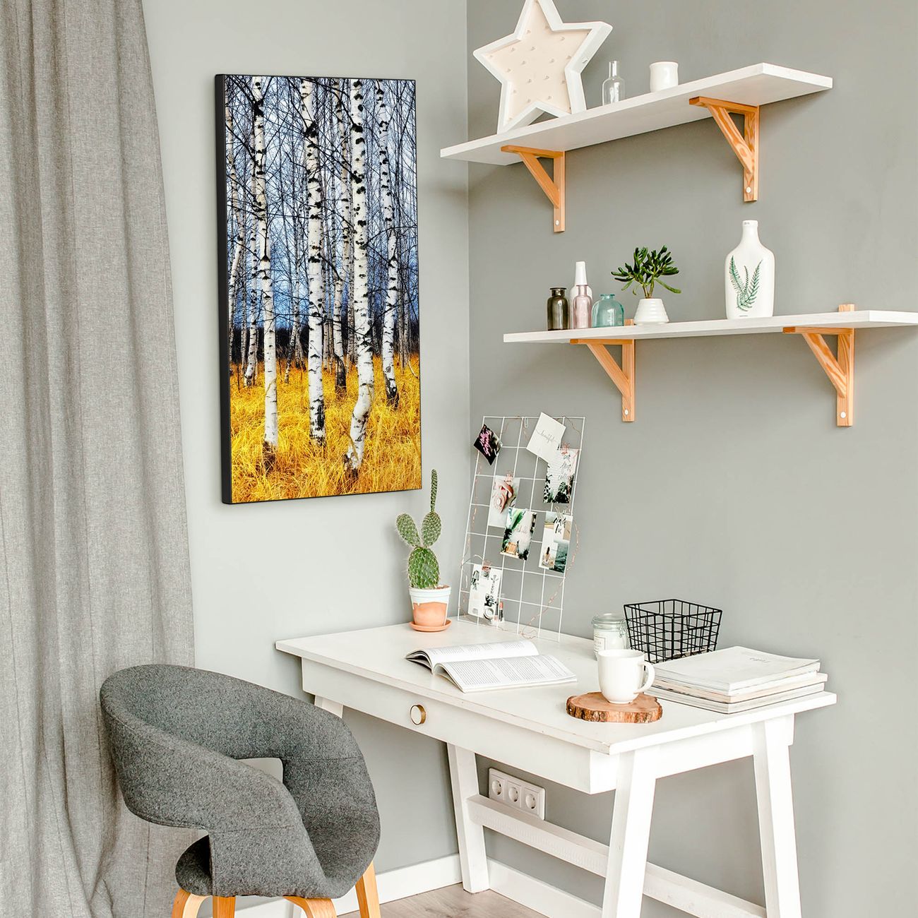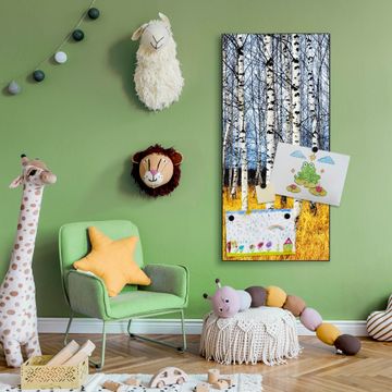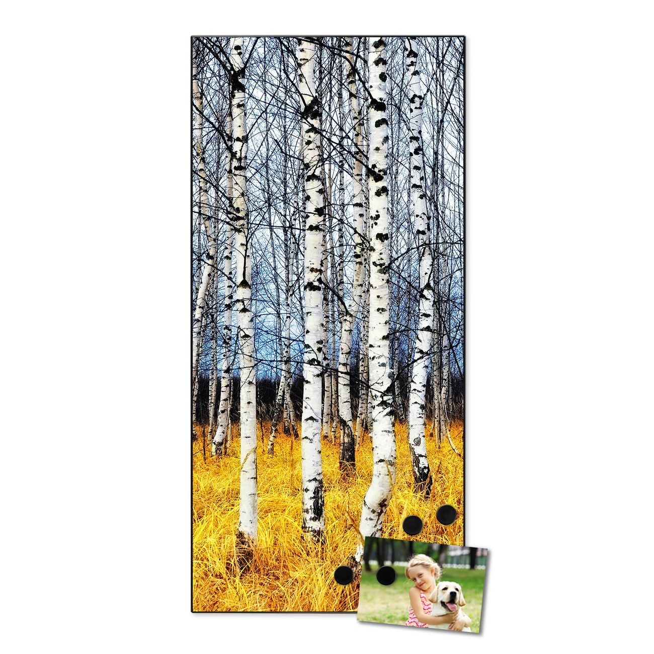 FUNKTION:  Die banjado Magnettafel mit Motiv Birkenhain Motiv bringt Ordnung in Ihr Zettelchaos. Fotos, Termine, Notizen oder Rezepte lassen Sich hier stilvoll mit Magneten ordnen, Sie behalten alles im Blick. An der Design Magnettafel halten alle handesüblichen Magnete. DESIGN:  Die magnetische Pinnwand mit dem Motiv Motiv Birkenhain ist ein eleganter Begleiter im Alltag. Mit dieser Memotafel aus Metall haben Sie auch ohne Notizen und Magnete ein schönes Dekoelement. Das Format bietet Ihnen ausreichend Platz um alle wichtigen Informationen im Blick zu behalten. DETAILS:  Die Magnettafel besteht aus silber-grau, weiß oder schwarzlackiertem Stahl. Sie hat eine Größe von 37 x 78 x 2cm. Es befinden sich auf der Rückseite vorgefertigte Aufhängungen die eine schnelle und unkomplizierte Anbringung ermöglichen. Das Motiv ist mit einem seidenmatten Laminat versehen und schützt so zusätzlich vor Kratzern. NUTZEN:  Sie können dieses Memoboard groß als Wandbild nutzen, es halten alle handelsüblichen Magneten daran. Die Pinnwand ist mit einem feuchten Lappen oder Schwamm abwischbar. Sie finden bei uns eine große Auswahl an passenden Magneten. BANJADO:  Wir sind ein kleines Team aus dem Herzen von Sachsen. Wir fertigen alle Artikel von Hand für Sie an, Sie erhalten keine preiswerte Importware. Auf Wunsch können Sie auch Ihr eigenes Foto auf die Magnettafel aufbringen, schreiben Sie uns an. Herzlichst, Ihr banjado-Team