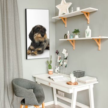 FUNKTION:  Die banjado Magnettafel mit Motiv Dackel Motiv bringt Ordnung in Ihr Zettelchaos. Fotos, Termine, Notizen oder Rezepte lassen Sich hier stilvoll mit Magneten ordnen, Sie behalten alles im Blick. An der Design Magnettafel halten alle handesüblichen Magnete. DESIGN:  Die magnetische Pinnwand mit dem Motiv Motiv Dackel ist ein eleganter Begleiter im Alltag. Mit dieser Memotafel aus Metall haben Sie auch ohne Notizen und Magnete ein schönes Dekoelement. Das Format bietet Ihnen ausreichend Platz um alle wichtigen Informationen im Blick zu behalten. DETAILS:  Die Magnettafel besteht aus silber-grau, weiß oder schwarzlackiertem Stahl. Sie hat eine Größe von 37 x 78 x 2cm. Es befinden sich auf der Rückseite vorgefertigte Aufhängungen die eine schnelle und unkomplizierte Anbringung ermöglichen. Das Motiv ist mit einem seidenmatten Laminat versehen und schützt so zusätzlich vor Kratzern. NUTZEN:  Sie können dieses Memoboard groß als Wandbild nutzen, es halten alle handelsüblichen Magneten daran. Die Pinnwand ist mit einem feuchten Lappen oder Schwamm abwischbar. Sie finden bei uns eine große Auswahl an passenden Magneten. BANJADO:  Wir sind ein kleines Team aus dem Herzen von Sachsen. Wir fertigen alle Artikel von Hand für Sie an, Sie erhalten keine preiswerte Importware. Auf Wunsch können Sie auch Ihr eigenes Foto auf die Magnettafel aufbringen, schreiben Sie uns an. Herzlichst, Ihr banjado-Team