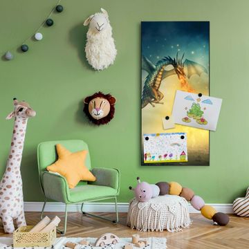 FUNKTION:  Die banjado Magnettafel mit Motiv Drachen Motiv bringt Ordnung in Ihr Zettelchaos. Fotos, Termine, Notizen oder Rezepte lassen Sich hier stilvoll mit Magneten ordnen, Sie behalten alles im Blick. An der Design Magnettafel halten alle handesüblichen Magnete. DESIGN:  Die magnetische Pinnwand mit dem Motiv Motiv Drachen ist ein eleganter Begleiter im Alltag. Mit dieser Memotafel aus Metall haben Sie auch ohne Notizen und Magnete ein schönes Dekoelement. Das Format bietet Ihnen ausreichend Platz um alle wichtigen Informationen im Blick zu behalten. DETAILS:  Die Magnettafel besteht aus silber-grau, weiß oder schwarzlackiertem Stahl. Sie hat eine Größe von 37 x 78 x 2cm. Es befinden sich auf der Rückseite vorgefertigte Aufhängungen die eine schnelle und unkomplizierte Anbringung ermöglichen. Das Motiv ist mit einem seidenmatten Laminat versehen und schützt so zusätzlich vor Kratzern. NUTZEN:  Sie können dieses Memoboard groß als Wandbild nutzen, es halten alle handelsüblichen Magneten daran. Die Pinnwand ist mit einem feuchten Lappen oder Schwamm abwischbar. Sie finden bei uns eine große Auswahl an passenden Magneten. BANJADO:  Wir sind ein kleines Team aus dem Herzen von Sachsen. Wir fertigen alle Artikel von Hand für Sie an, Sie erhalten keine preiswerte Importware. Auf Wunsch können Sie auch Ihr eigenes Foto auf die Magnettafel aufbringen, schreiben Sie uns an. Herzlichst, Ihr banjado-Team