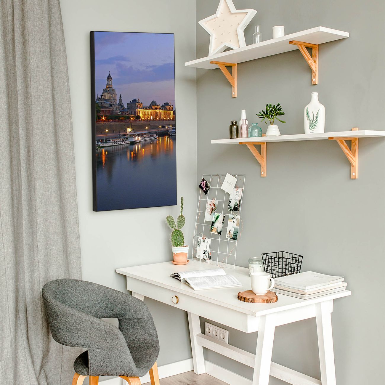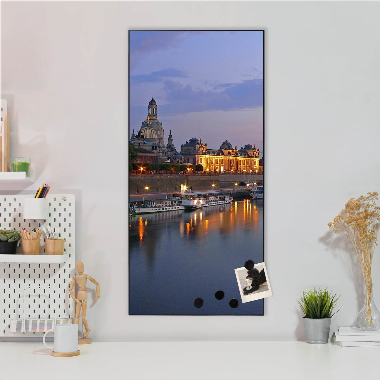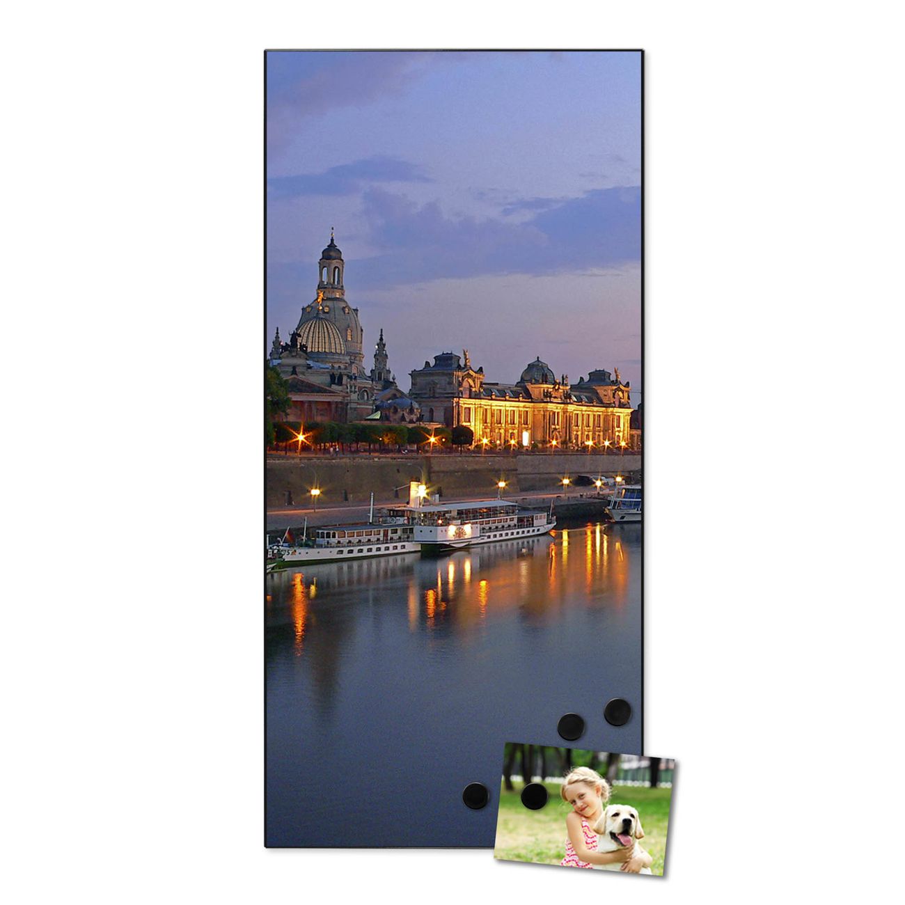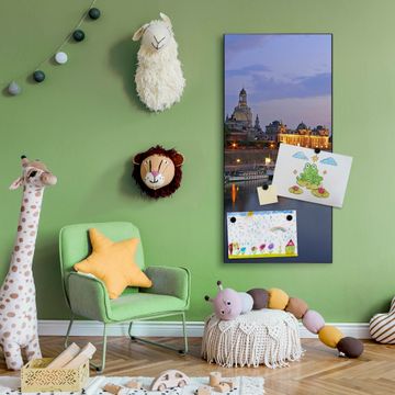 FUNKTION:  Die banjado Magnettafel mit Motiv Dresden Motiv bringt Ordnung in Ihr Zettelchaos. Fotos, Termine, Notizen oder Rezepte lassen Sich hier stilvoll mit Magneten ordnen, Sie behalten alles im Blick. An der Design Magnettafel halten alle handesüblichen Magnete. DESIGN:  Die magnetische Pinnwand mit dem Motiv Motiv Dresden ist ein eleganter Begleiter im Alltag. Mit dieser Memotafel aus Metall haben Sie auch ohne Notizen und Magnete ein schönes Dekoelement. Das Format bietet Ihnen ausreichend Platz um alle wichtigen Informationen im Blick zu behalten. DETAILS:  Die Magnettafel besteht aus silber-grau, weiß oder schwarzlackiertem Stahl. Sie hat eine Größe von 37 x 78 x 2cm. Es befinden sich auf der Rückseite vorgefertigte Aufhängungen die eine schnelle und unkomplizierte Anbringung ermöglichen. Das Motiv ist mit einem seidenmatten Laminat versehen und schützt so zusätzlich vor Kratzern. NUTZEN:  Sie können dieses Memoboard groß als Wandbild nutzen, es halten alle handelsüblichen Magneten daran. Die Pinnwand ist mit einem feuchten Lappen oder Schwamm abwischbar. Sie finden bei uns eine große Auswahl an passenden Magneten. BANJADO:  Wir sind ein kleines Team aus dem Herzen von Sachsen. Wir fertigen alle Artikel von Hand für Sie an, Sie erhalten keine preiswerte Importware. Auf Wunsch können Sie auch Ihr eigenes Foto auf die Magnettafel aufbringen, schreiben Sie uns an. Herzlichst, Ihr banjado-Team