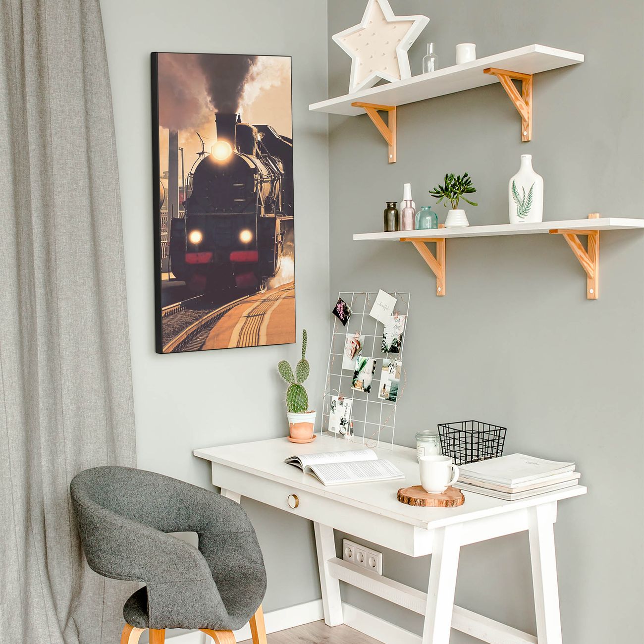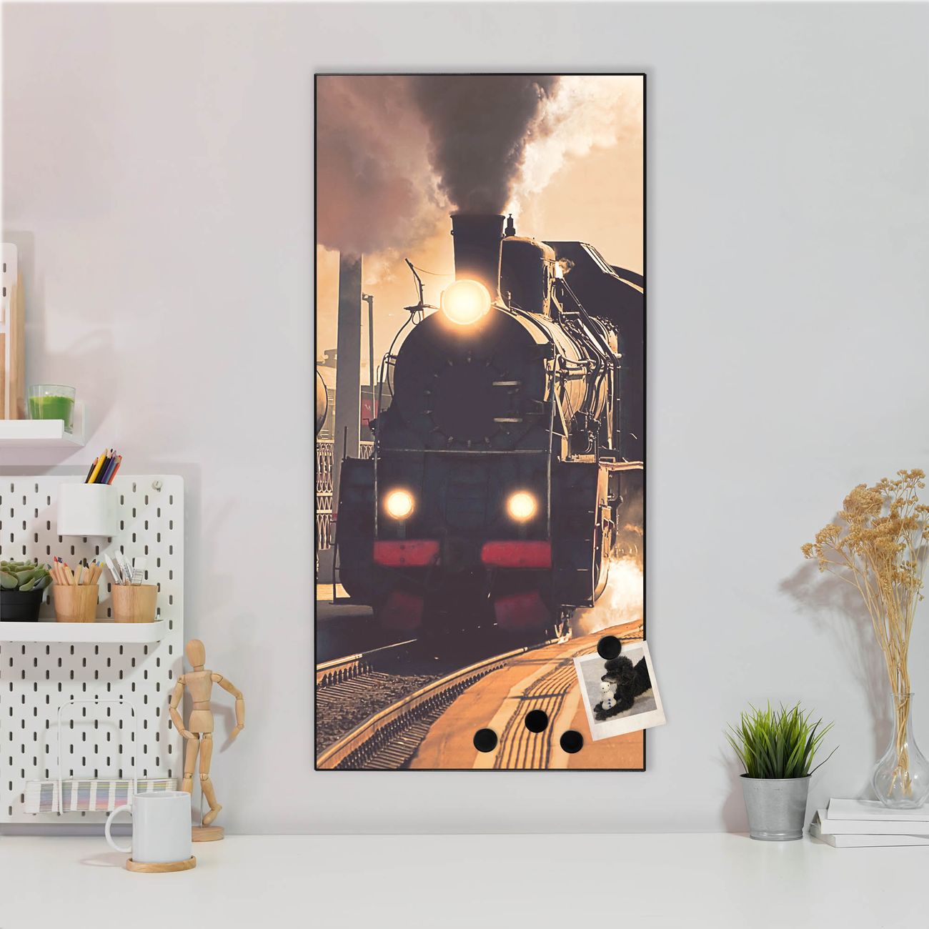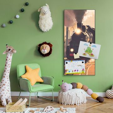 FUNKTION:  Die banjado Magnettafel mit Motiv Einfahrender Zug Motiv bringt Ordnung in Ihr Zettelchaos. Fotos, Termine, Notizen oder Rezepte lassen Sich hier stilvoll mit Magneten ordnen, Sie behalten alles im Blick. An der Design Magnettafel halten alle handesüblichen Magnete. DESIGN:  Die magnetische Pinnwand mit dem Motiv Motiv Einfahrender Zug ist ein eleganter Begleiter im Alltag. Mit dieser Memotafel aus Metall haben Sie auch ohne Notizen und Magnete ein schönes Dekoelement. Das Format bietet Ihnen ausreichend Platz um alle wichtigen Informationen im Blick zu behalten. DETAILS:  Die Magnettafel besteht aus silber-grau, weiß oder schwarzlackiertem Stahl. Sie hat eine Größe von 37 x 78 x 2cm. Es befinden sich auf der Rückseite vorgefertigte Aufhängungen die eine schnelle und unkomplizierte Anbringung ermöglichen. Das Motiv ist mit einem seidenmatten Laminat versehen und schützt so zusätzlich vor Kratzern. NUTZEN:  Sie können dieses Memoboard groß als Wandbild nutzen, es halten alle handelsüblichen Magneten daran. Die Pinnwand ist mit einem feuchten Lappen oder Schwamm abwischbar. Sie finden bei uns eine große Auswahl an passenden Magneten. BANJADO:  Wir sind ein kleines Team aus dem Herzen von Sachsen. Wir fertigen alle Artikel von Hand für Sie an, Sie erhalten keine preiswerte Importware. Auf Wunsch können Sie auch Ihr eigenes Foto auf die Magnettafel aufbringen, schreiben Sie uns an. Herzlichst, Ihr banjado-Team