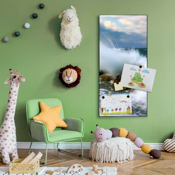 FUNKTION:  Die banjado Magnettafel mit Motiv Einsteinwelle Motiv bringt Ordnung in Ihr Zettelchaos. Fotos, Termine, Notizen oder Rezepte lassen Sich hier stilvoll mit Magneten ordnen, Sie behalten alles im Blick. An der Design Magnettafel halten alle handesüblichen Magnete. DESIGN:  Die magnetische Pinnwand mit dem Motiv Motiv Einsteinwelle ist ein eleganter Begleiter im Alltag. Mit dieser Memotafel aus Metall haben Sie auch ohne Notizen und Magnete ein schönes Dekoelement. Das Format bietet Ihnen ausreichend Platz um alle wichtigen Informationen im Blick zu behalten. DETAILS:  Die Magnettafel besteht aus silber-grau, weiß oder schwarzlackiertem Stahl. Sie hat eine Größe von 37 x 78 x 2cm. Es befinden sich auf der Rückseite vorgefertigte Aufhängungen die eine schnelle und unkomplizierte Anbringung ermöglichen. Das Motiv ist mit einem seidenmatten Laminat versehen und schützt so zusätzlich vor Kratzern. NUTZEN:  Sie können dieses Memoboard groß als Wandbild nutzen, es halten alle handelsüblichen Magneten daran. Die Pinnwand ist mit einem feuchten Lappen oder Schwamm abwischbar. Sie finden bei uns eine große Auswahl an passenden Magneten. BANJADO:  Wir sind ein kleines Team aus dem Herzen von Sachsen. Wir fertigen alle Artikel von Hand für Sie an, Sie erhalten keine preiswerte Importware. Auf Wunsch können Sie auch Ihr eigenes Foto auf die Magnettafel aufbringen, schreiben Sie uns an. Herzlichst, Ihr banjado-Team