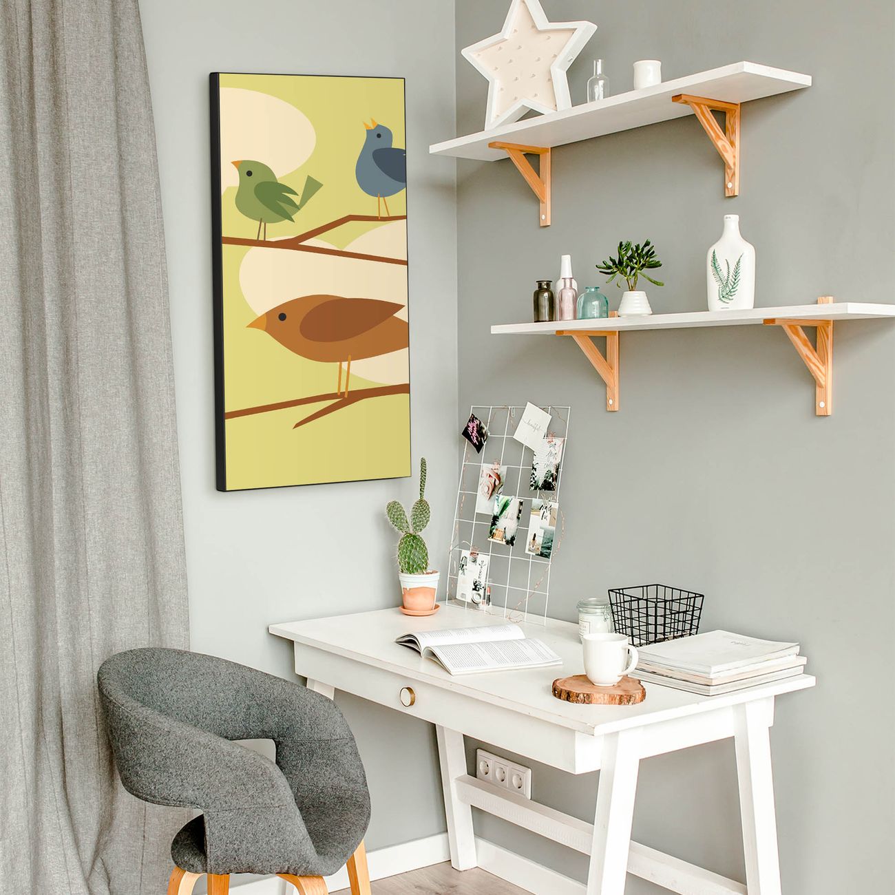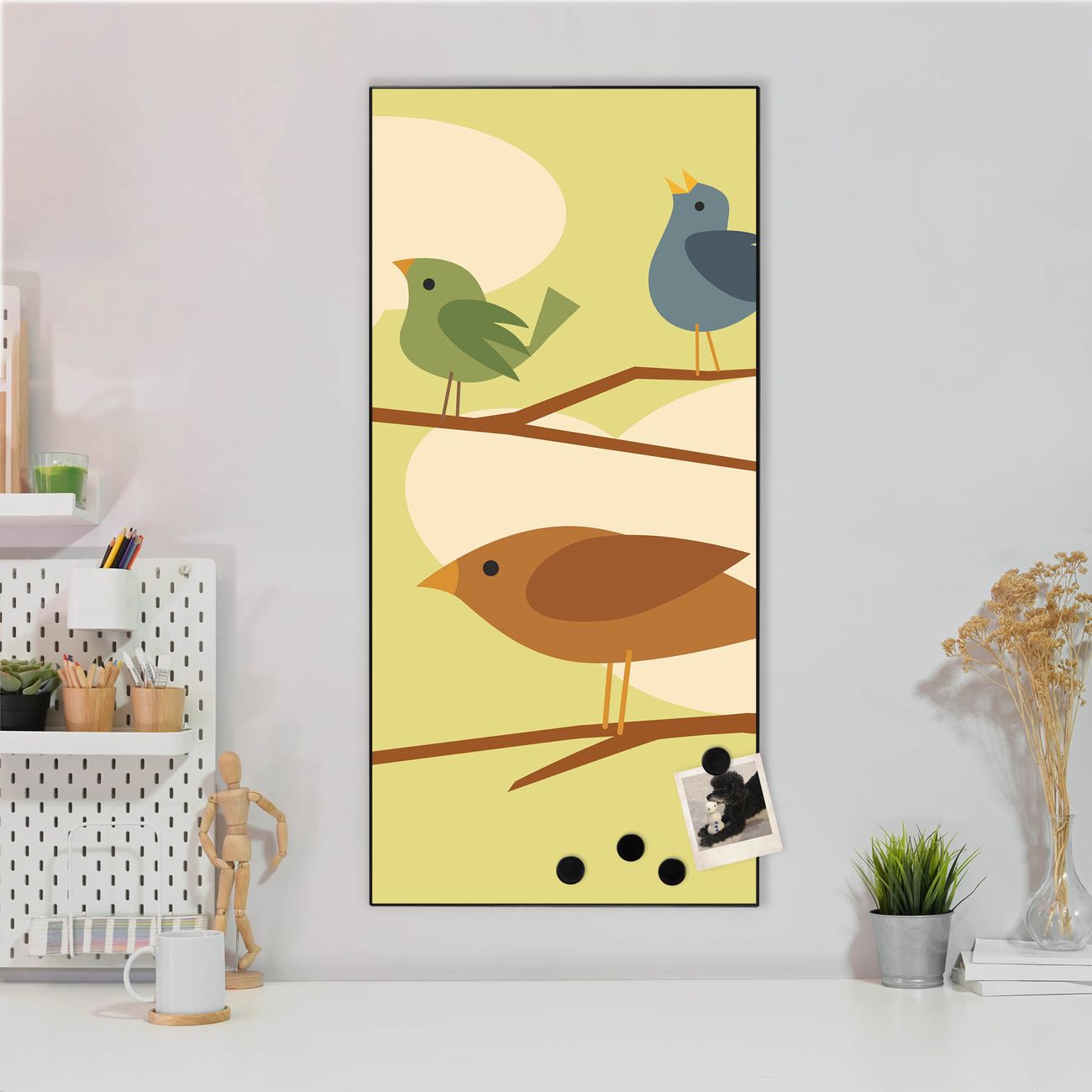 FUNKTION:  Die banjado Magnettafel mit Motiv Fünf Vögel Motiv bringt Ordnung in Ihr Zettelchaos. Fotos, Termine, Notizen oder Rezepte lassen Sich hier stilvoll mit Magneten ordnen, Sie behalten alles im Blick. An der Design Magnettafel halten alle handesüblichen Magnete. DESIGN:  Die magnetische Pinnwand mit dem Motiv Motiv Fünf Vögel ist ein eleganter Begleiter im Alltag. Mit dieser Memotafel aus Metall haben Sie auch ohne Notizen und Magnete ein schönes Dekoelement. Das Format bietet Ihnen ausreichend Platz um alle wichtigen Informationen im Blick zu behalten. DETAILS:  Die Magnettafel besteht aus silber-grau, weiß oder schwarzlackiertem Stahl. Sie hat eine Größe von 37 x 78 x 2cm. Es befinden sich auf der Rückseite vorgefertigte Aufhängungen die eine schnelle und unkomplizierte Anbringung ermöglichen. Das Motiv ist mit einem seidenmatten Laminat versehen und schützt so zusätzlich vor Kratzern. NUTZEN:  Sie können dieses Memoboard groß als Wandbild nutzen, es halten alle handelsüblichen Magneten daran. Die Pinnwand ist mit einem feuchten Lappen oder Schwamm abwischbar. Sie finden bei uns eine große Auswahl an passenden Magneten. BANJADO:  Wir sind ein kleines Team aus dem Herzen von Sachsen. Wir fertigen alle Artikel von Hand für Sie an, Sie erhalten keine preiswerte Importware. Auf Wunsch können Sie auch Ihr eigenes Foto auf die Magnettafel aufbringen, schreiben Sie uns an. Herzlichst, Ihr banjado-Team