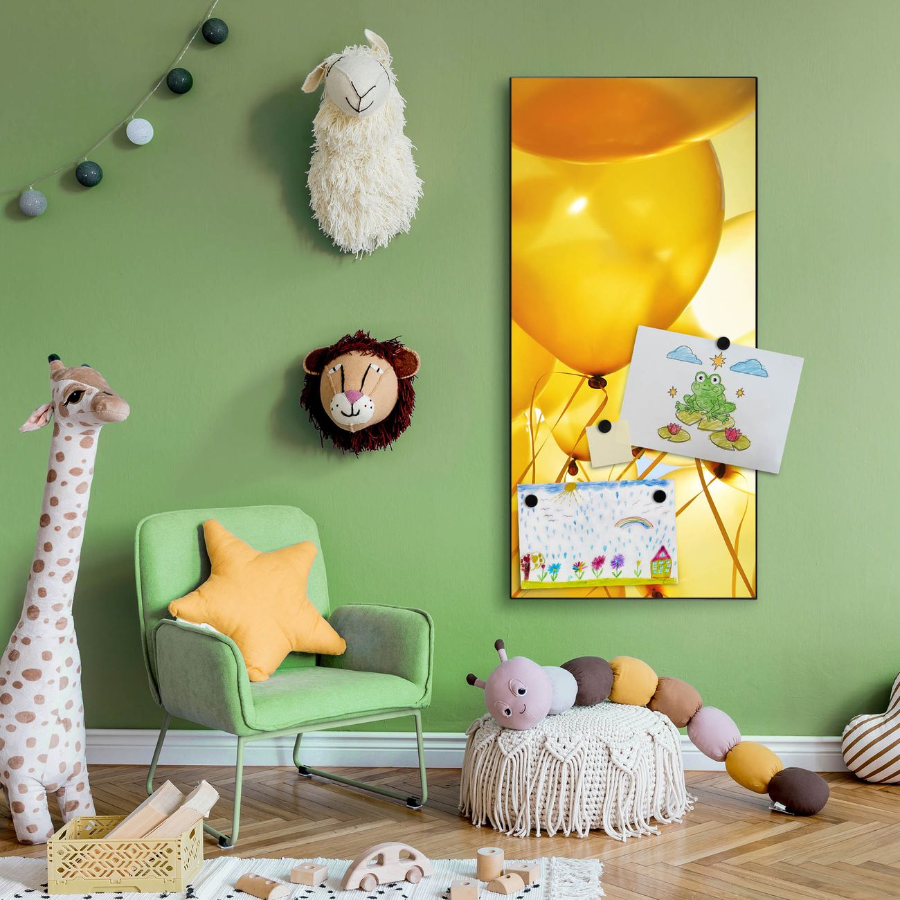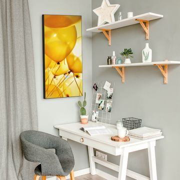 FUNKTION:  Die banjado Magnettafel mit Motiv Gelbe Luftballons Motiv bringt Ordnung in Ihr Zettelchaos. Fotos, Termine, Notizen oder Rezepte lassen Sich hier stilvoll mit Magneten ordnen, Sie behalten alles im Blick. An der Design Magnettafel halten alle handesüblichen Magnete. DESIGN:  Die magnetische Pinnwand mit dem Motiv Motiv Gelbe Luftballons ist ein eleganter Begleiter im Alltag. Mit dieser Memotafel aus Metall haben Sie auch ohne Notizen und Magnete ein schönes Dekoelement. Das Format bietet Ihnen ausreichend Platz um alle wichtigen Informationen im Blick zu behalten. DETAILS:  Die Magnettafel besteht aus silber-grau, weiß oder schwarzlackiertem Stahl. Sie hat eine Größe von 37 x 78 x 2cm. Es befinden sich auf der Rückseite vorgefertigte Aufhängungen die eine schnelle und unkomplizierte Anbringung ermöglichen. Das Motiv ist mit einem seidenmatten Laminat versehen und schützt so zusätzlich vor Kratzern. NUTZEN:  Sie können dieses Memoboard groß als Wandbild nutzen, es halten alle handelsüblichen Magneten daran. Die Pinnwand ist mit einem feuchten Lappen oder Schwamm abwischbar. Sie finden bei uns eine große Auswahl an passenden Magneten. BANJADO:  Wir sind ein kleines Team aus dem Herzen von Sachsen. Wir fertigen alle Artikel von Hand für Sie an, Sie erhalten keine preiswerte Importware. Auf Wunsch können Sie auch Ihr eigenes Foto auf die Magnettafel aufbringen, schreiben Sie uns an. Herzlichst, Ihr banjado-Team