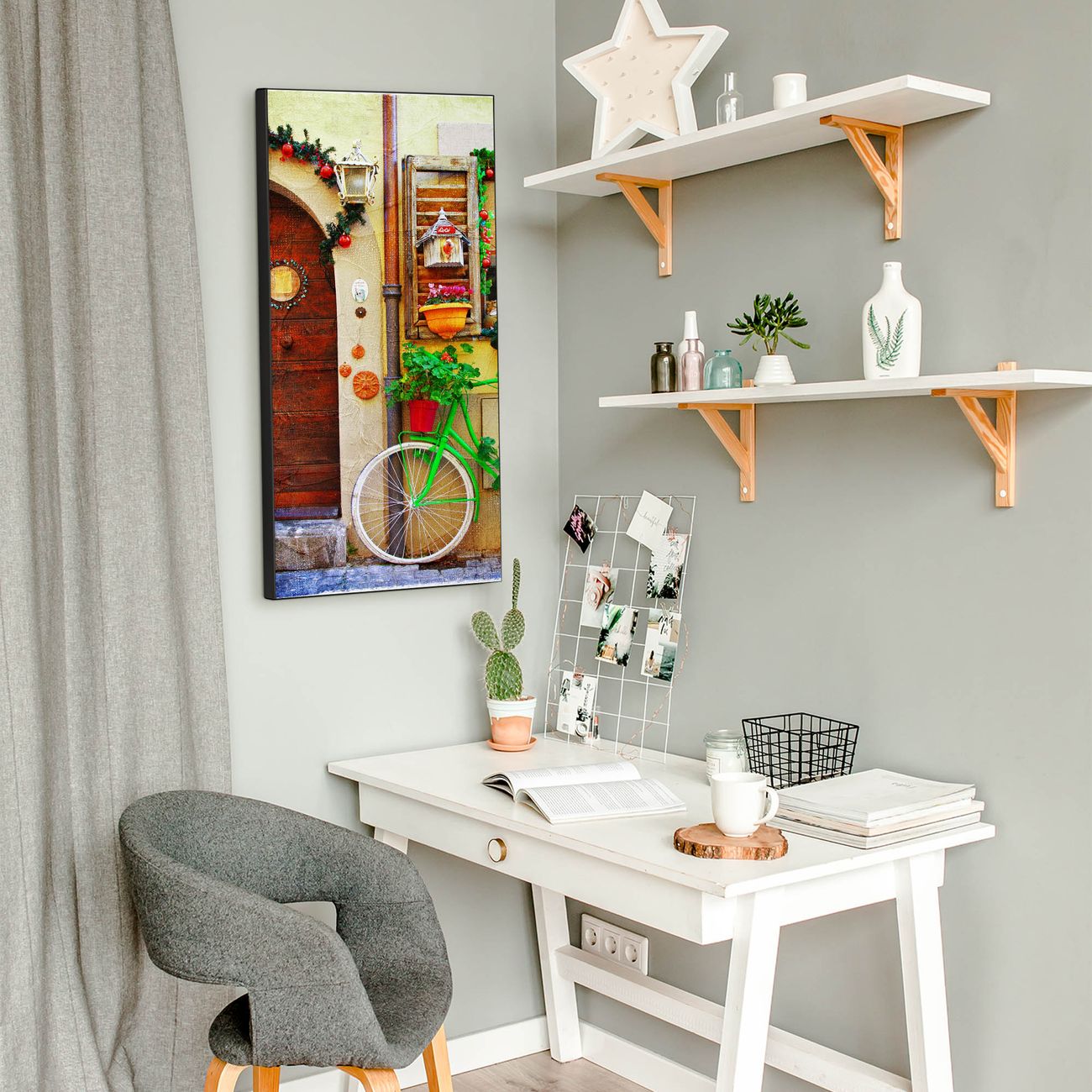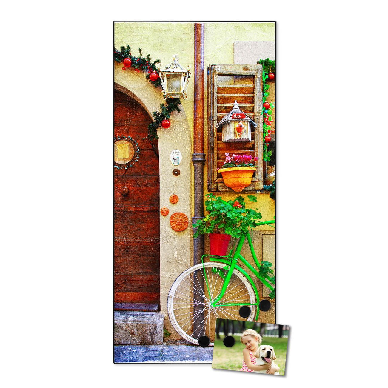 FUNKTION:  Die banjado Magnettafel mit Motiv Grünes Fahrrad Motiv bringt Ordnung in Ihr Zettelchaos. Fotos, Termine, Notizen oder Rezepte lassen Sich hier stilvoll mit Magneten ordnen, Sie behalten alles im Blick. An der Design Magnettafel halten alle handesüblichen Magnete. DESIGN:  Die magnetische Pinnwand mit dem Motiv Motiv Grünes Fahrrad ist ein eleganter Begleiter im Alltag. Mit dieser Memotafel aus Metall haben Sie auch ohne Notizen und Magnete ein schönes Dekoelement. Das Format bietet Ihnen ausreichend Platz um alle wichtigen Informationen im Blick zu behalten. DETAILS:  Die Magnettafel besteht aus silber-grau, weiß oder schwarzlackiertem Stahl. Sie hat eine Größe von 37 x 78 x 2cm. Es befinden sich auf der Rückseite vorgefertigte Aufhängungen die eine schnelle und unkomplizierte Anbringung ermöglichen. Das Motiv ist mit einem seidenmatten Laminat versehen und schützt so zusätzlich vor Kratzern. NUTZEN:  Sie können dieses Memoboard groß als Wandbild nutzen, es halten alle handelsüblichen Magneten daran. Die Pinnwand ist mit einem feuchten Lappen oder Schwamm abwischbar. Sie finden bei uns eine große Auswahl an passenden Magneten. BANJADO:  Wir sind ein kleines Team aus dem Herzen von Sachsen. Wir fertigen alle Artikel von Hand für Sie an, Sie erhalten keine preiswerte Importware. Auf Wunsch können Sie auch Ihr eigenes Foto auf die Magnettafel aufbringen, schreiben Sie uns an. Herzlichst, Ihr banjado-Team